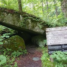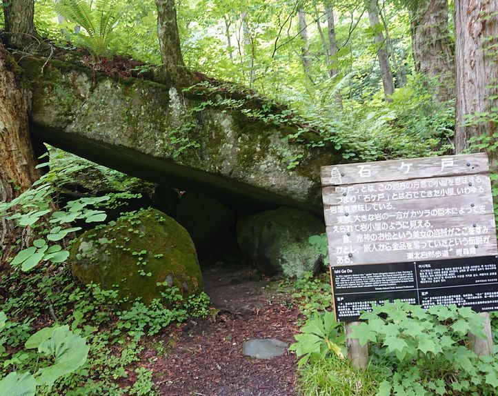 三乱の流れから渓流沿いを上流に向かって歩きました。石ヶ戸には20分ぐらいで着きました。石ヶ戸とはこちらの方言で「石でできた小屋」という意味だそうです。カツラの木が大きな岩を支えていて隙間ができていました。鬼神の美女のお松という盗賊が住んでいたと書かれた説明板にはちょと笑ってしまいました。
