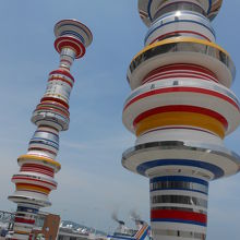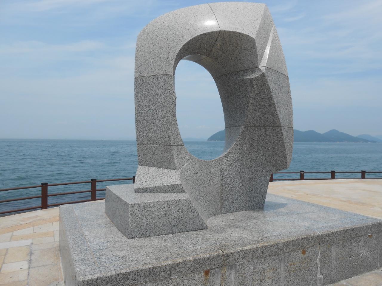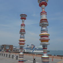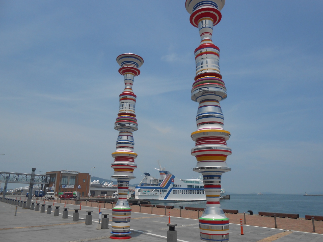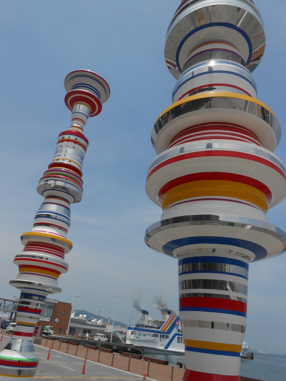 高松港のフェリー乗り場の近くに、リミナルエアコアが立っています。鮮やかな色合いの独楽のような高い塔が2本。船や海が見え、絶好の写真スポットです。作者は、現代美術作家の大巻伸嗣という人です。2010年作、高さ800cmです。ここから200mくらいの海辺の散策路には、Matakitenoという作品もあります。こちらは彫刻家、作庭家の流政之さんの作です。