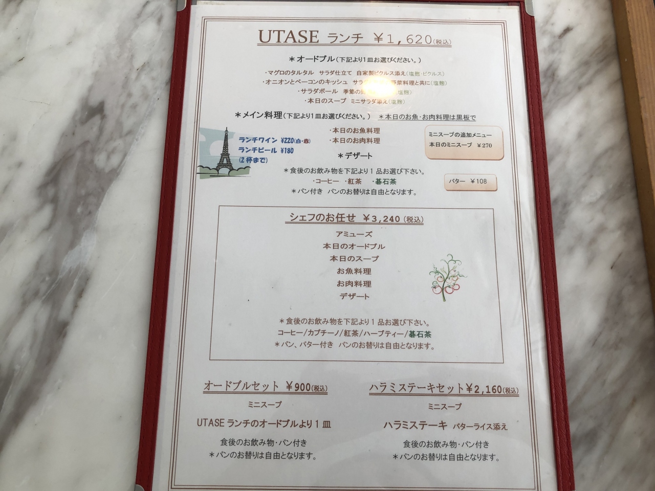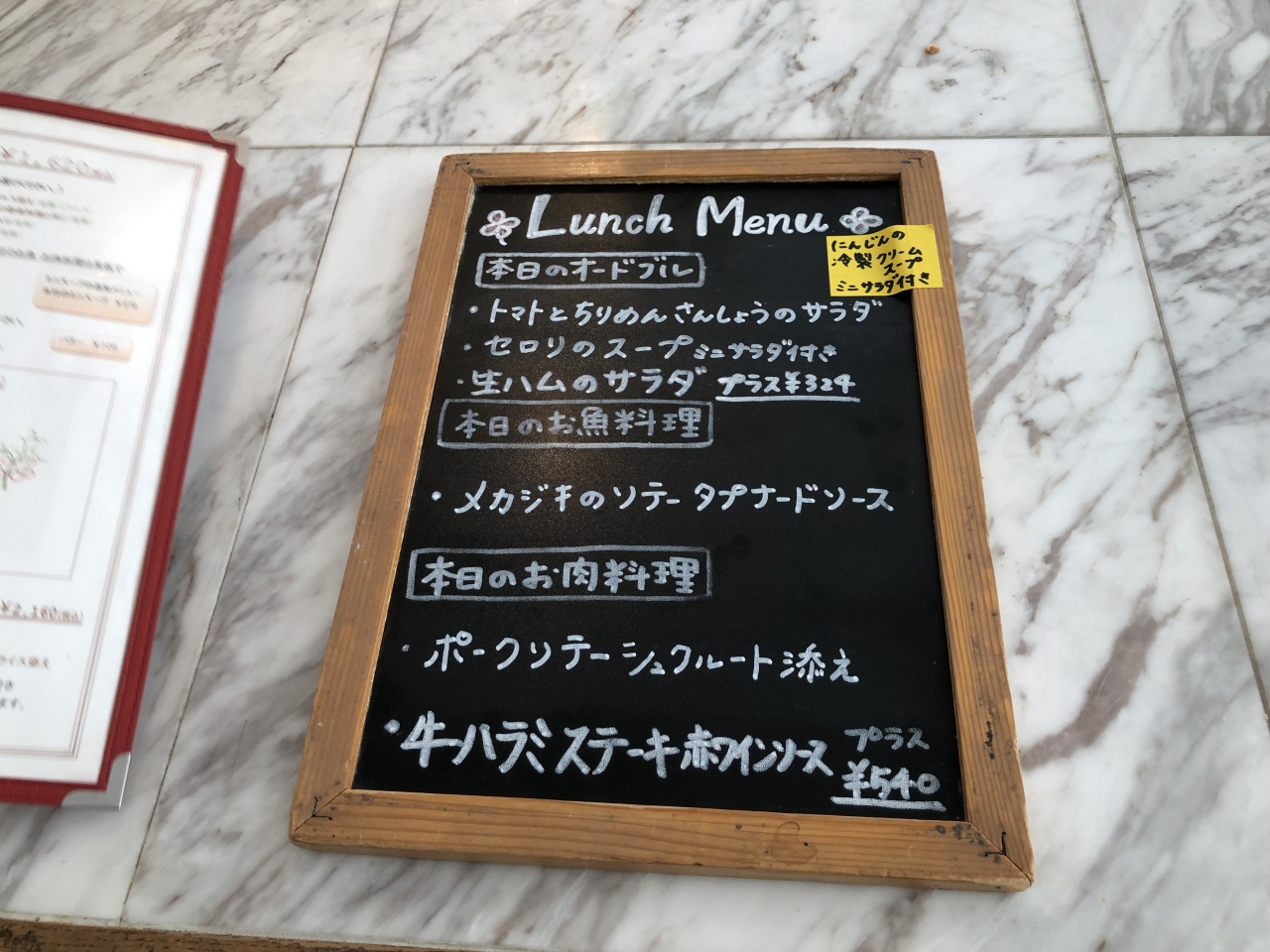 友達に誘われて、車2台で行きました。店の前が路上駐車可の区域です。メニューは前菜+メインの肉か魚+デザート+飲み物で1620円。人参の冷製スープとサラダ、メカジキ、プラマンジュとチョコレートケーキ、アイスティー。どれも美味しく、今度は娘を連れて来ます。