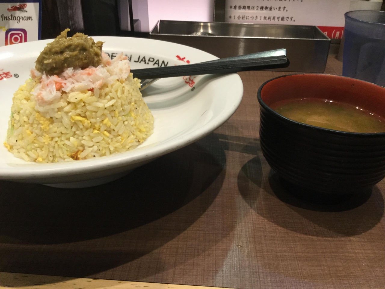 大阪駅の「駅マルシェ」というレストランラン街は駅近で、いい店が集まって歩くだけでも楽しいです。そこで見つけて、前から気になっていた「カニチャーハンの店」にやっと行くことができました。調べたら都心で大人気のお店で、関西初と書いてあって、大阪のお店も遅い時間にも関わらず混んでいました。カニチャーハンに絞っているだけあって、嬉しくなる美味しさです。かにみそチャーハンが限定であったのでいただき、食べやすいうす味に玉子の味がほのかにする上品なチャーハンに蟹みそが程よく乗っていて、こんなに美味しいチャーハンあるんだと幸せな思いになれました。小さい店ですが店員の方も感じのいい、夜も10時半までしていてくれて、また行って美味しいカニチャーハンを頂きたいです。