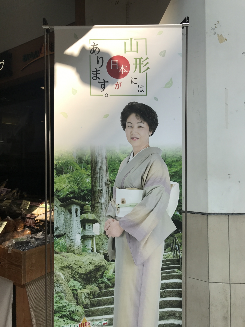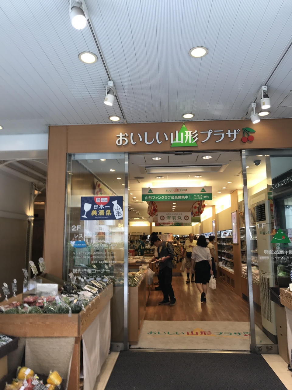 初めて山形プラザに入りました。店頭にはスイカが並んでいて、店内には切られたスイカが売られていました。頼めば好きなように切ってもらえるそうです。その他、ナスの漬物や冷たい肉蕎麦など季節物の商品が多くて楽しめます。水が綺麗なところなので、夏酒を購入しました。