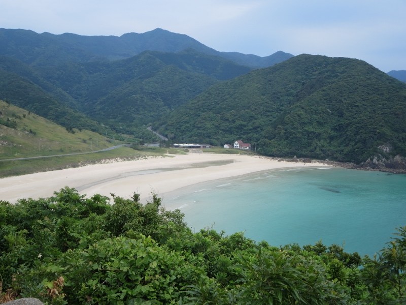 魚藍観音の立っている高台から見えた海水浴場です。海水浴には少し早い時期だったので誰もいませんでした。海の色はため息が出るほど美しかったです。福江島の中でも人が少ない地域なので、シーズン中でもゆっくり楽しめるかも知れません。