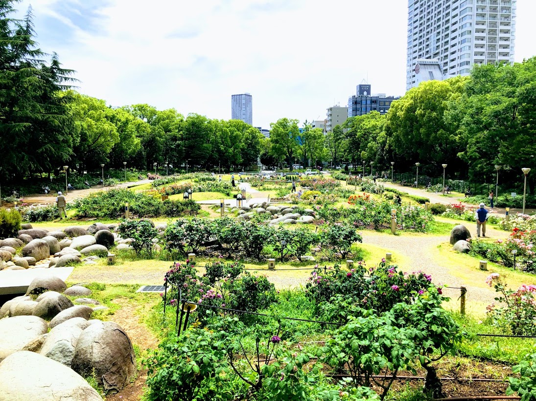 この公園は、戦後占領軍が飛行場に使っていた場所で大阪都心にあるのに長方形の広い公園なのでウオーキングするにはもってこいです。以前はテニスコートがあるくらいで夜になると鬱蒼とした樹木が不気味な感じでしたが、今では綺麗に整備されてバラ園は、まるでベルサイユ宮殿の庭かと突っ込みを入れたくなるくらい見事でした。