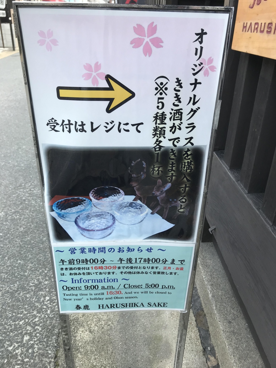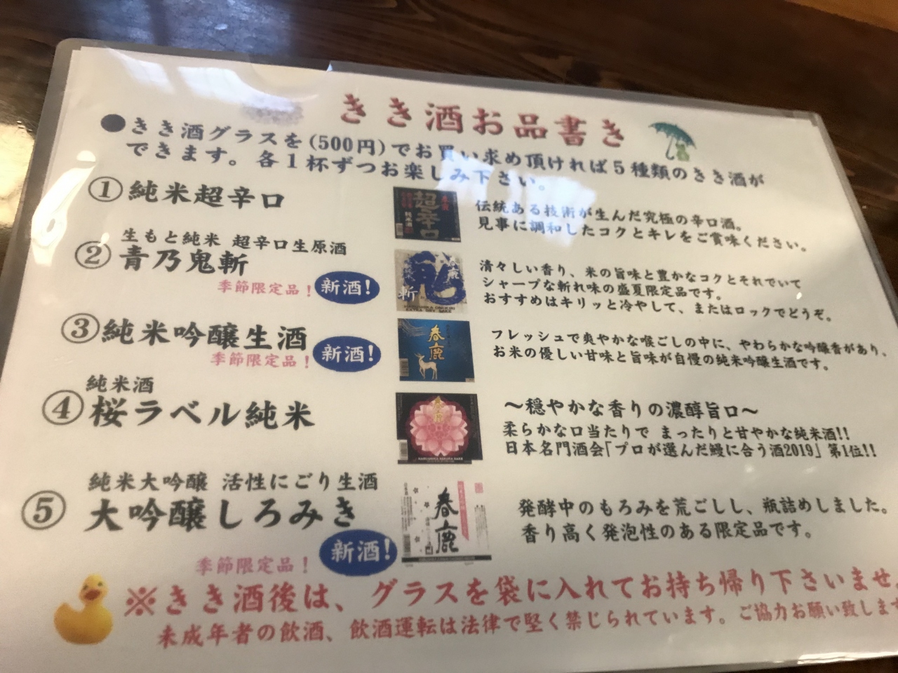 ワンコイン(500円)で美味しいお酒5種類を利き酒。奈良観光のお土産話にもうってつけ。