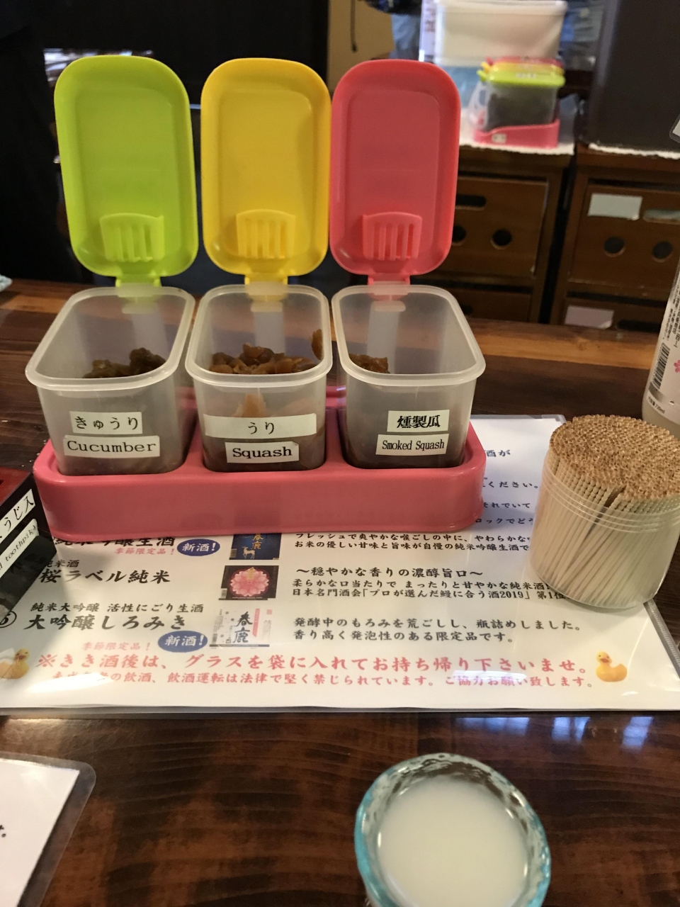 利き酒の時、最後の酒の時に、つまみに3種の奈良漬けを出してくれる。