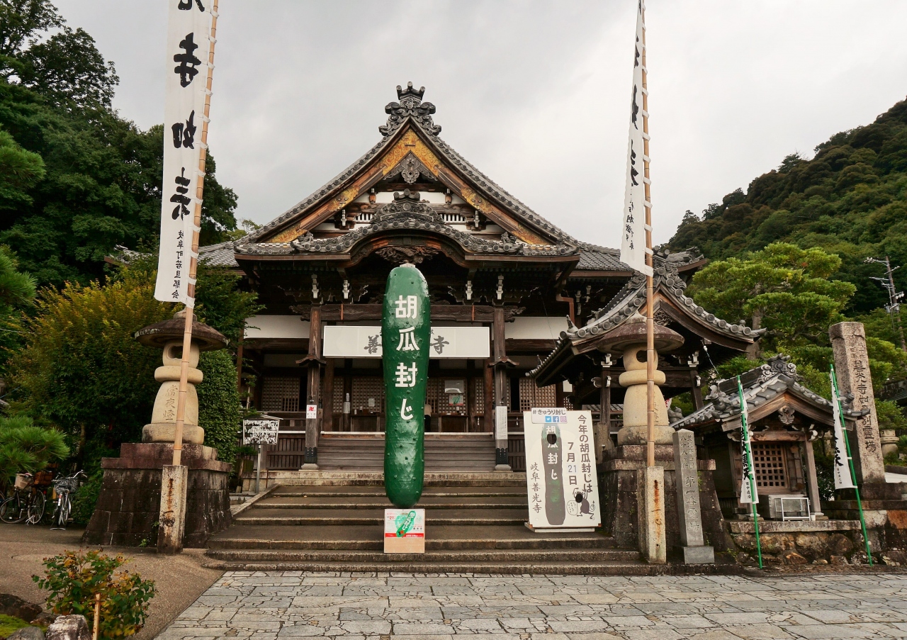 本堂の前のジャンボ胡瓜が印象的、毎夏の仏事「胡瓜封じ」を広く知らせる風物詩だそうです。