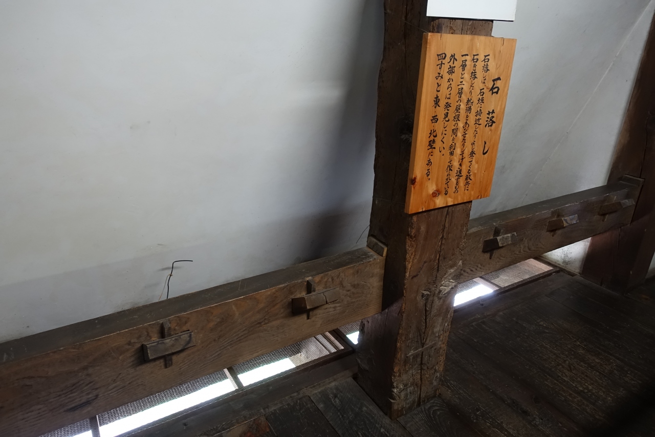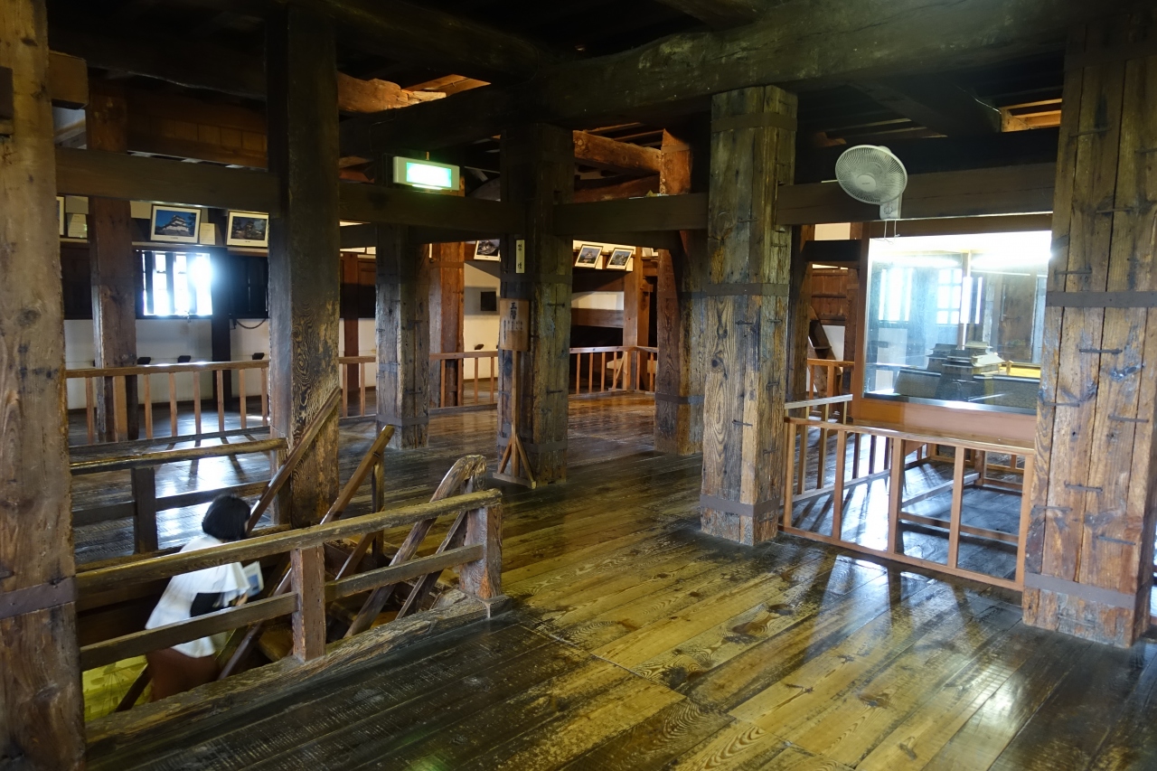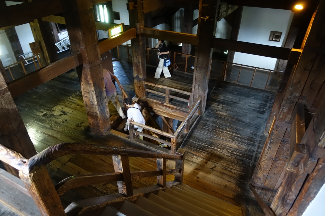 本物のお城なので土足は靴箱へ入れて見学となります。当然エレベーターは無く、急な階段の上り下りが必須。でも木造そのままのお城の醍醐味を味わえて最高でした。エアコンも無いのですが、一部では柱に扇風機が付いていてちょっと違和感があるかな。本来この扇風機もいらない気がするんだけどどうなんだろう。写真撮影は自由にできました。