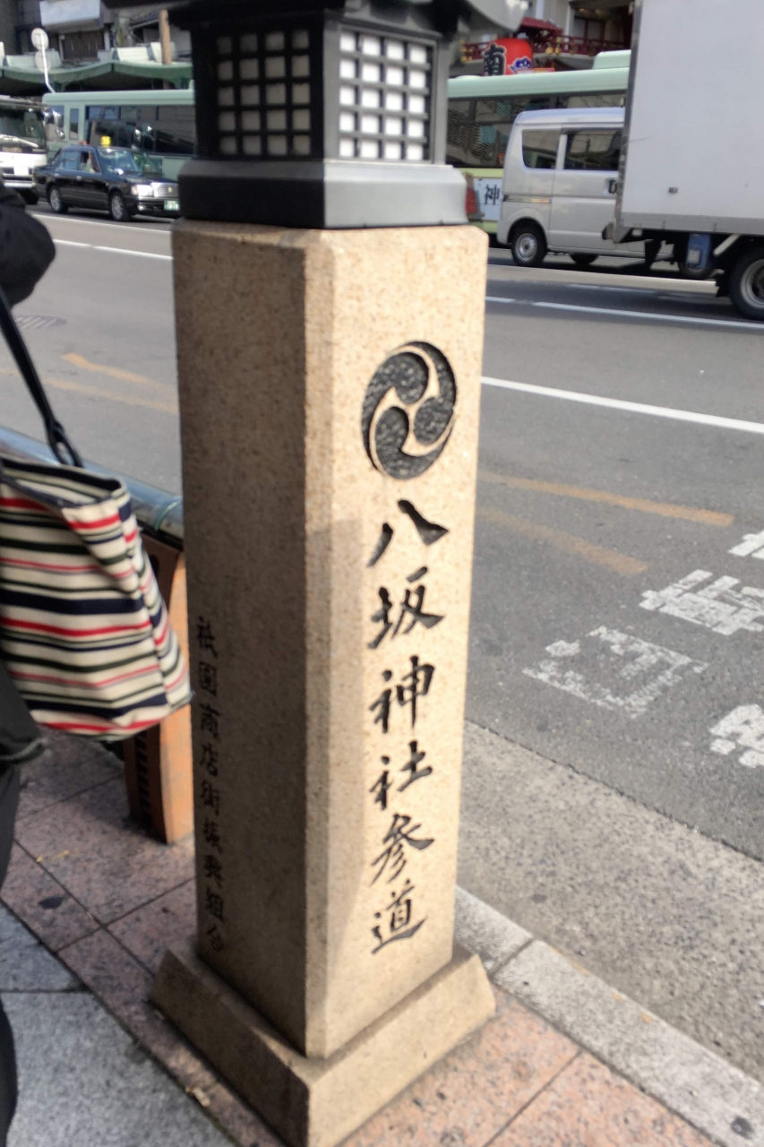 京都でも有数の繁華街にもなっている四条通。交通の要衝にもなっているので交通の便はよいです。ここは八坂神社の参道でもあるので、東山区側にはこの通り八坂神社参道の石塔も。京都でも有名なお店が多いので、おみやげをかったり、飲食を楽しむのにもいい場所です。