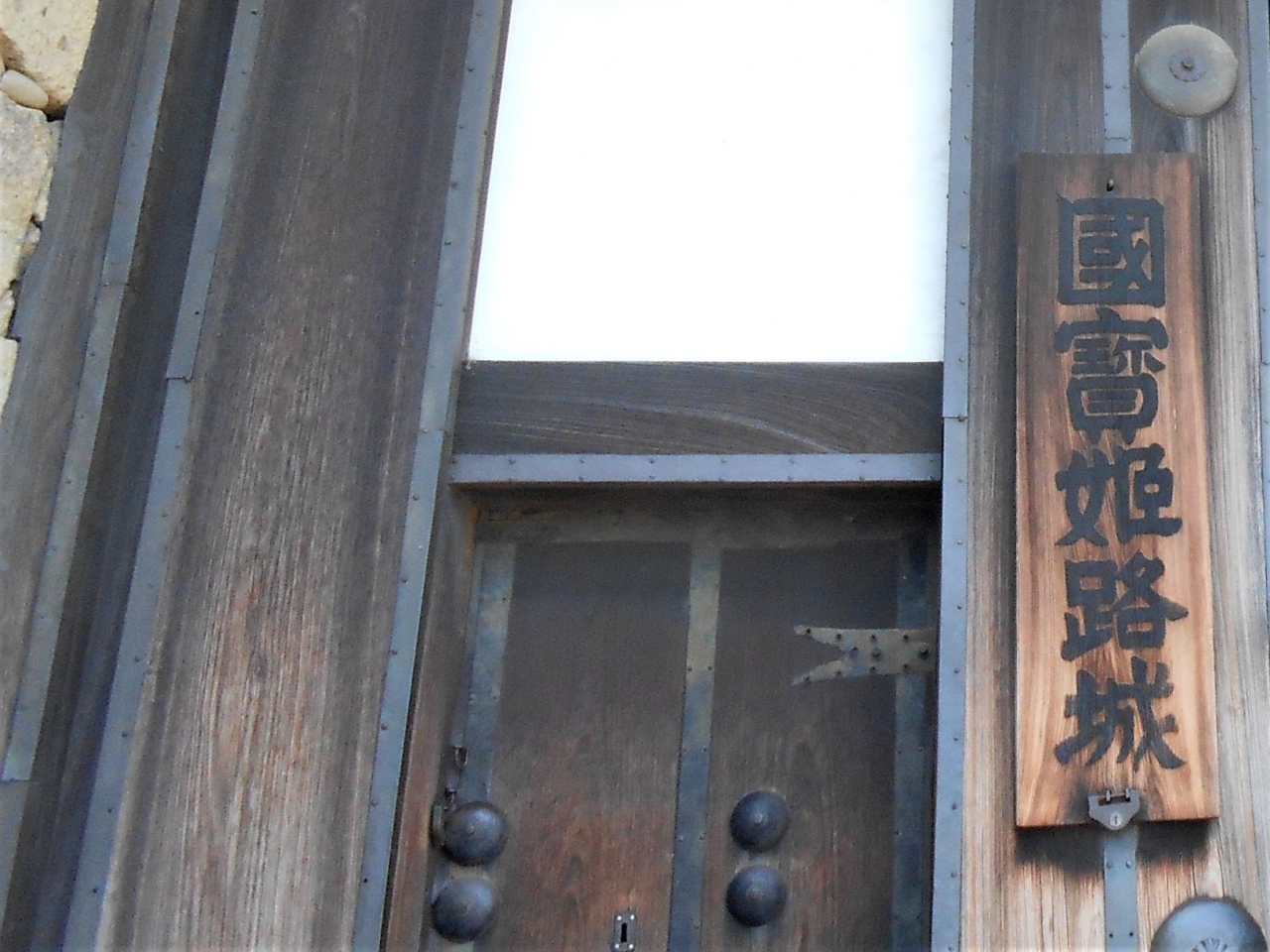 姫路城の入場口で入場券を買い、入場口から入り、少し曲がった階段を上るとあるのが、菱の門です。一番初めに通る門です。きれいな格式のある門です。門の左側には、国寶姫路城、と木製の看板がつけられています。