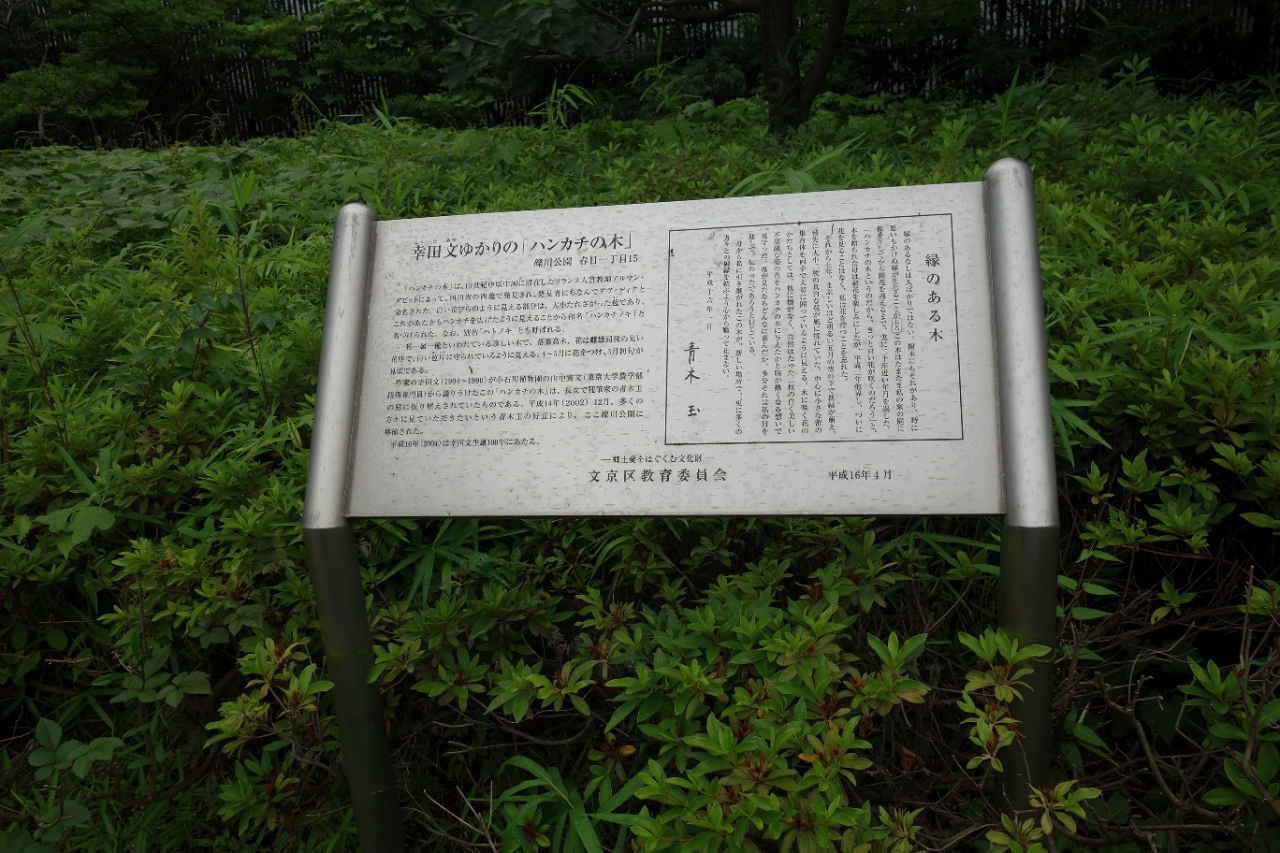 水道橋や後楽園あたりのエリアを散策中こちらの場所へ立ち寄りました。後楽園駅に隣接する礫川公園の一角にハンカチの木が植えられていて傍には解説板が有りました。作家幸田文の長女である青木玉によって寄贈されたものだそうです。