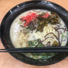 店内に入るとまず自販機で食券を購入です。ごく普通のラーメンを食べました、写真は高菜と紅ショウガの無料トッピングをした状態です。きれいに彩りができスープもきれいです。