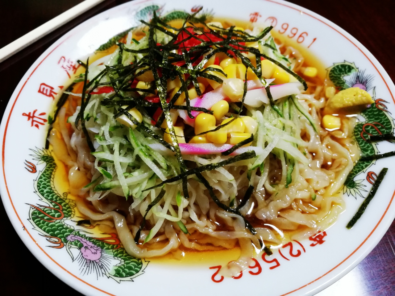 盆休みに佐野の実家に帰った際に、子供の頃から食べていた、赤見屋の冷やし中華と餃子を出前で届けてもらい食べました。佐野ラーメンといえば温かい醤油ラーメンのイメージが強いですが、冷やし中華も美味しいですよ。