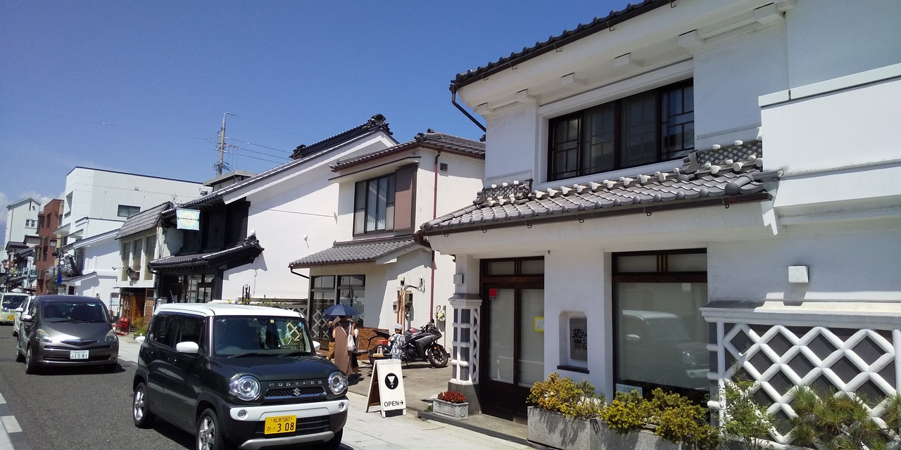 道路両側には、白壁なまこ壁の店舗や蔵などが並ぶ美観地区になっています。