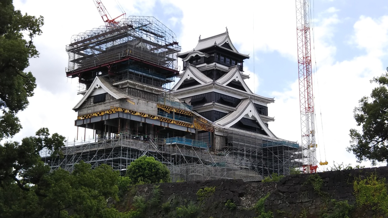 熊本地震から3年以上が経過し、熊本城もずいぶん再建されてきました。石垣を見ると、壊れたままのところが多く、痛々しい感じがしました。天守閣は一つはほぼ出来上がっていましたが、もう一つはまだ外観もできてなく、クレーン車も見えました。