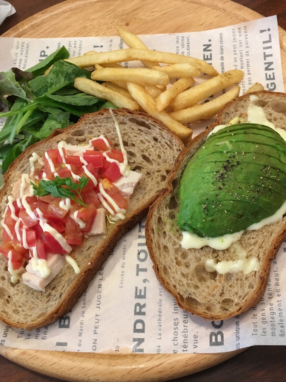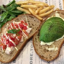 アボカドやトマトとチキンののったオープンホットサンドをいただきました。