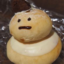 ジャム入りのパン2個を、ホワイトチョコのクリームで接着し、防止に見立てたクッキーを乗せ、チョコレートソースで顔を描いている。