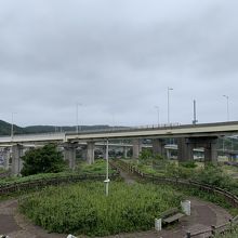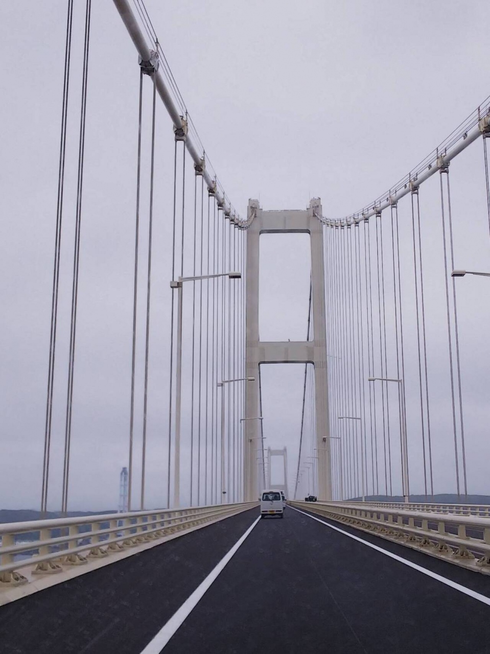 美しい吊り橋ですが国道の橋の上は駐停車禁止なので同乗者に撮影してもらった。橋に乗る前の交差点から脇道に入っていくと展望台の駐車場があり全体像を見ることができる。ループ状に高さを増していくアプローチもいい。