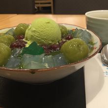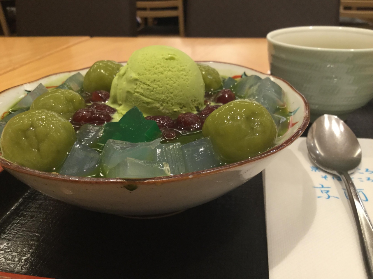 京都駅の地下街ポルタの中にある、甘党のお店で軽食も有ります。ここのあんみつが好きで、いつも抹茶アイスクリームをトッピングします。あっさりとした、あんみつは喉ごしつるりとして、あんことアイスクリームと甘さを引き立てています。白玉も付いていて、これも抹茶味でつるりとして美味しかったです。素朴で懐かしいあんみつは、いつも心をホッと和ませてくれます。