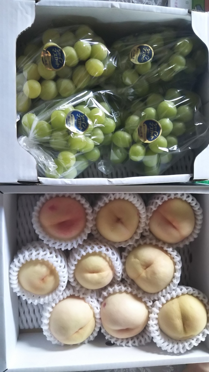 この時期は、桃やマスカット、ピオーネといったブドウがおいしい時期でもあり朝早くから争奪戦?郵送もできるのでお中元などで利用するのにも。