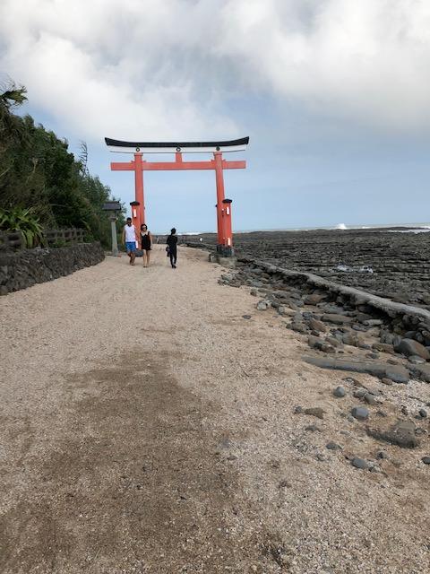 砂利ではなく、海の砂の上を歩いて参拝します。サンダルで行くと、足が痛くて、砂も暑くて、苦労します。駐車場はないので、道路沿いの駐車場にレンタカーを停めて参拝しましたが、台風直後の強風の中、神社まで歩くのはとても遠く感じました。