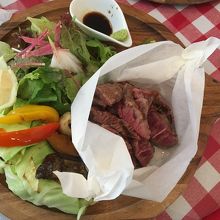 お盆休みの夕食、暑くて夏バテ気味だったので美味しい肉を食べようと思い入った店です。マ メゾンの系列のお店らしいですが本当に美味しかったです。温野菜、サラダとお肉のグリル プレートを注文しましたが、わさび醤油で食べるステーキは あっさりして美味しく頂けました。