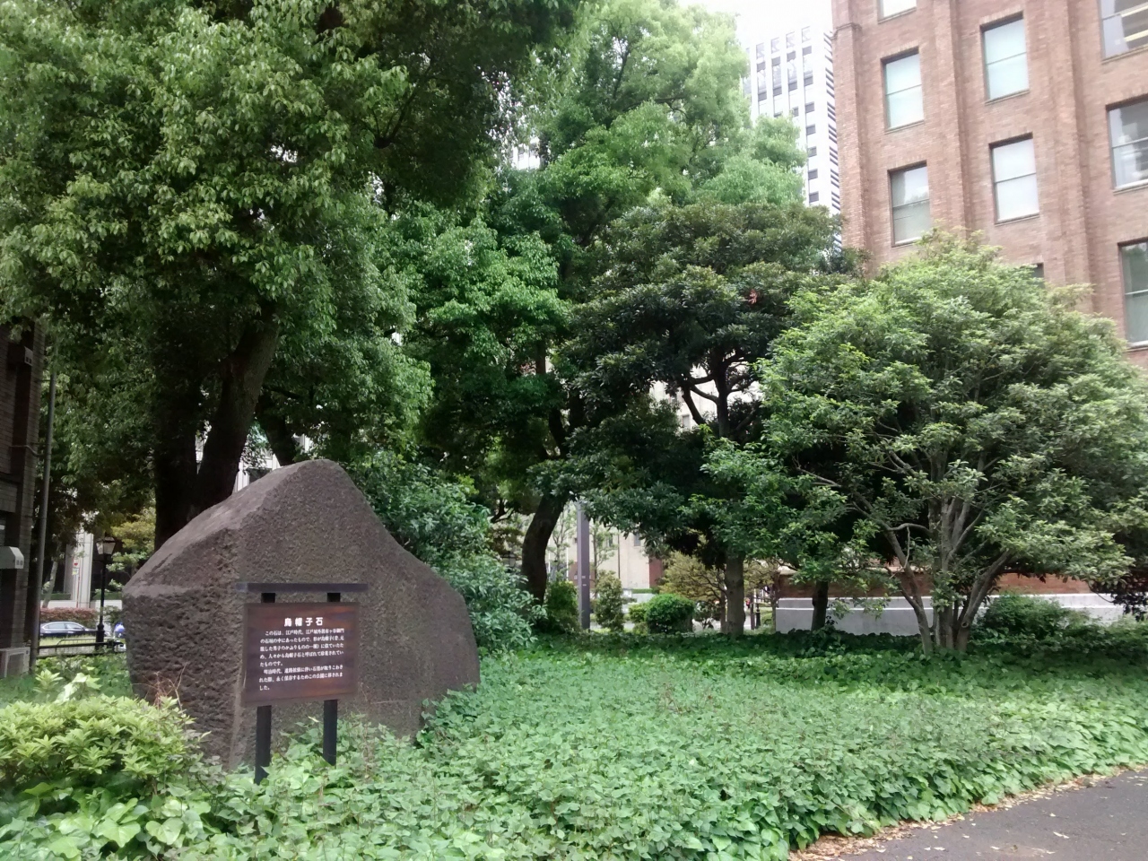 日比谷公園の烏帽子石は、日比谷公会堂近くにあって、説明板つきなので、直ぐ分かります。名前通りに烏帽子に似ていますが、かなり大きいので、もともとあった市ヶ谷門の石垣から日比谷公園へ持ってくるのに大変な苦労だっただろうと想像できました。