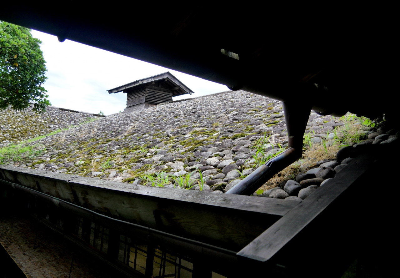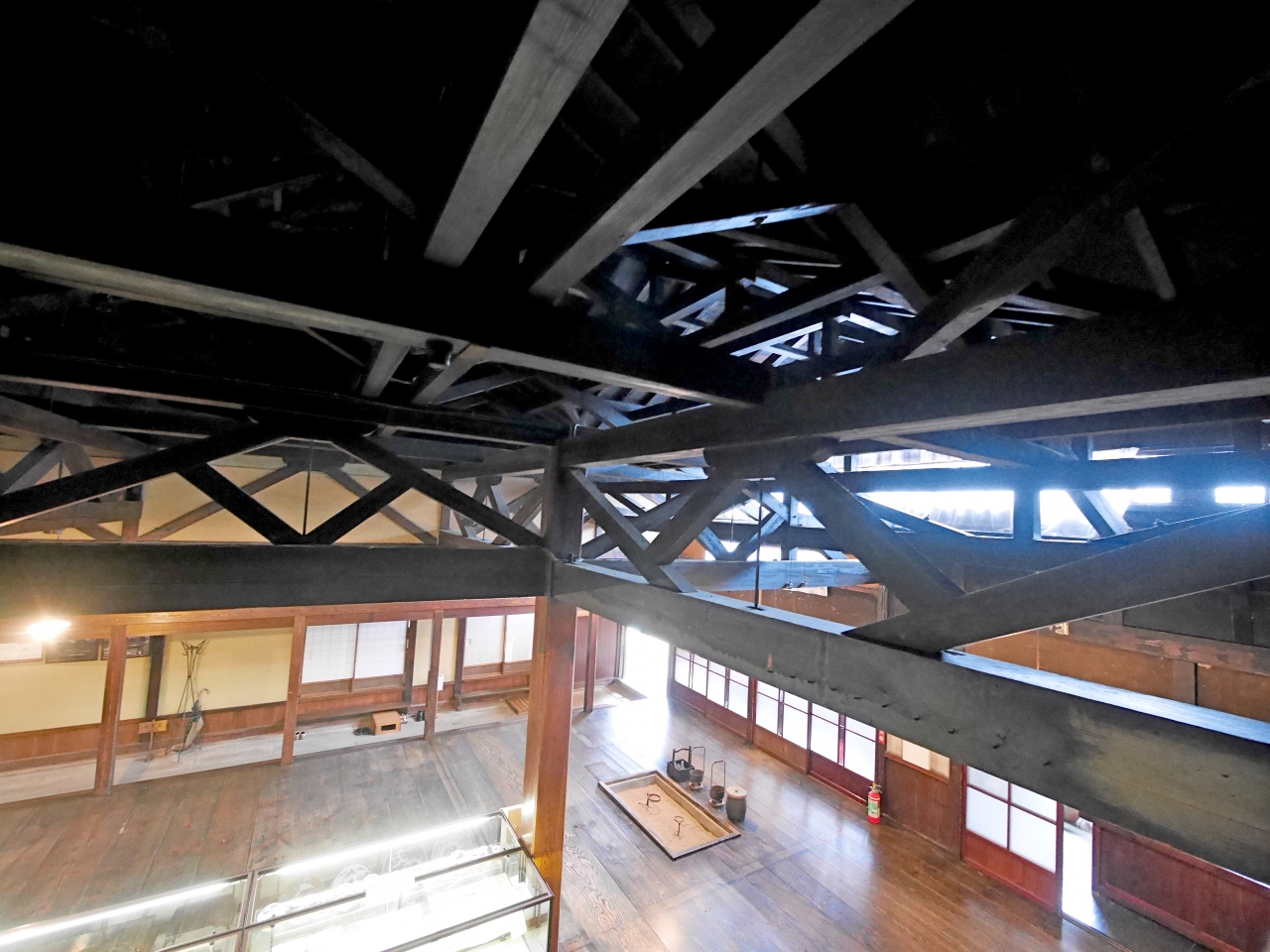 石置き屋根がすばらしい また今回は6月の村上の地震の後だったので,30tの石をささえるトラス構造の梁,大黒柱によって,しっかりと造られたこの住宅に感心する.明治27年の酒田地震を教訓に建てたとのこと.ここで風間銀行として銀行やっていたんだねえ.今の荘内銀行の一つの前身だ.石置き屋根とトラス構造が必見!