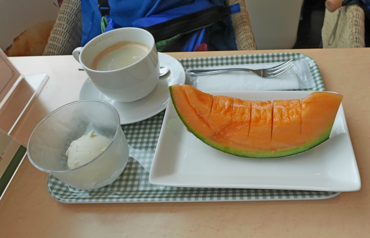 商工会議所の会館にある.お土産屋がメイン その一角に小さなカフェがある 月の雫の塩ミルクジェラート400円とホットコーヒー300円 わたりはぱりろカフェ600円とリンゴ酢ドリンク500円 もう一人の同僚はメロンカフェ(ジェラート付き)500円など,周りに休むところがないので貴重だ トイレが凄い 鶴岡の水族館のイメージかなあ これは一見の価値がある 水槽があって金魚が泳いでいる