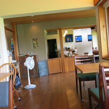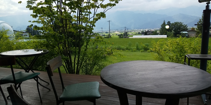洒落た外観、木を基調にした落ち着いた店内、広く取った窓からは常念岳をはじめとした北アルプスの名峰を遠望することができます。手前にはのどかな田園風景、眺めだけでも癒されます。