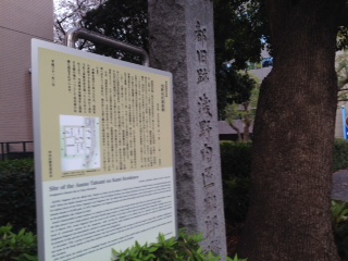 聖路加国際大学の敷地のすぐわきに浅野内匠頭邸跡の石碑を見つけました。この辺り一帯が赤穂藩主浅野家の江戸上屋敷だったとの事。明治初期の旧外国人居住地を散策している最中にたまたま見つけた碑ですが、それよりかなり昔にも、この地が、歴史の表舞台に登ったのかと思うと、とても不思議な感じがしました。