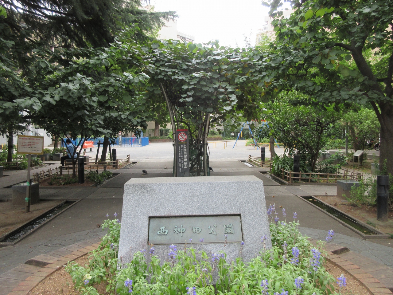 白山通りと専大通りの間にある公園です。ビルに囲まれた明るい公園です。レンガで造った円形の花壇とベンチが入口にあります。浅い水が流れている木陰やコミュニティサイクルちよくるのポートがあります。砂場、すべり台、ブランコなどの遊具や7種類の健康器具があります。健康器具の前にゲートボールのラインがあることから児童や大人のための公園であることがわかります。8月平日の午前に訪れました。ベンチで休む人がいるだけで閑散としていました。