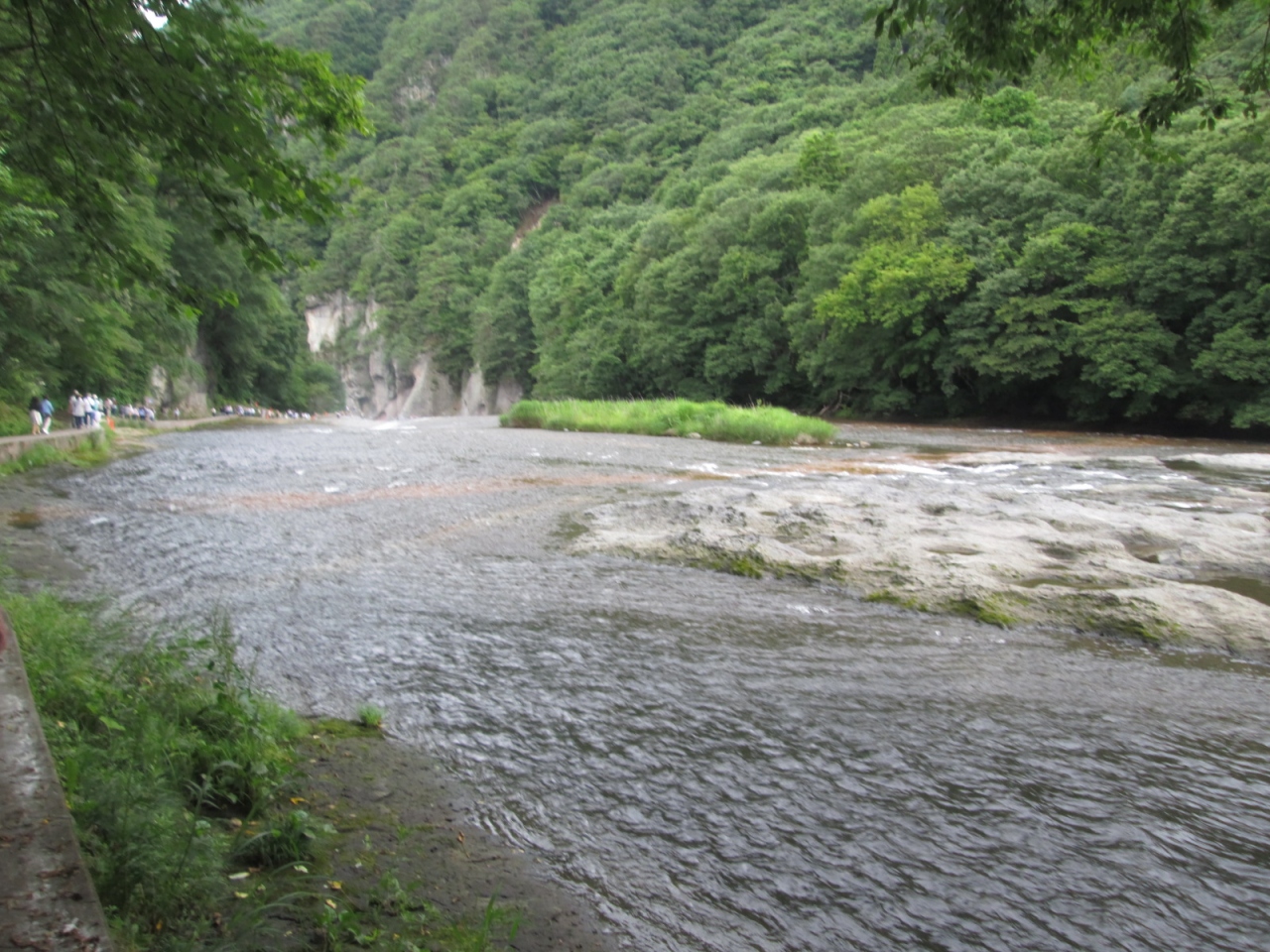 それが吹割の滝で、大な岩が吹き割れたように見えるところから、その名が付いたとのことで、滝近くまで来たところロープで規制され、当日は水量が多くて直近での見学は出来ませんでした。