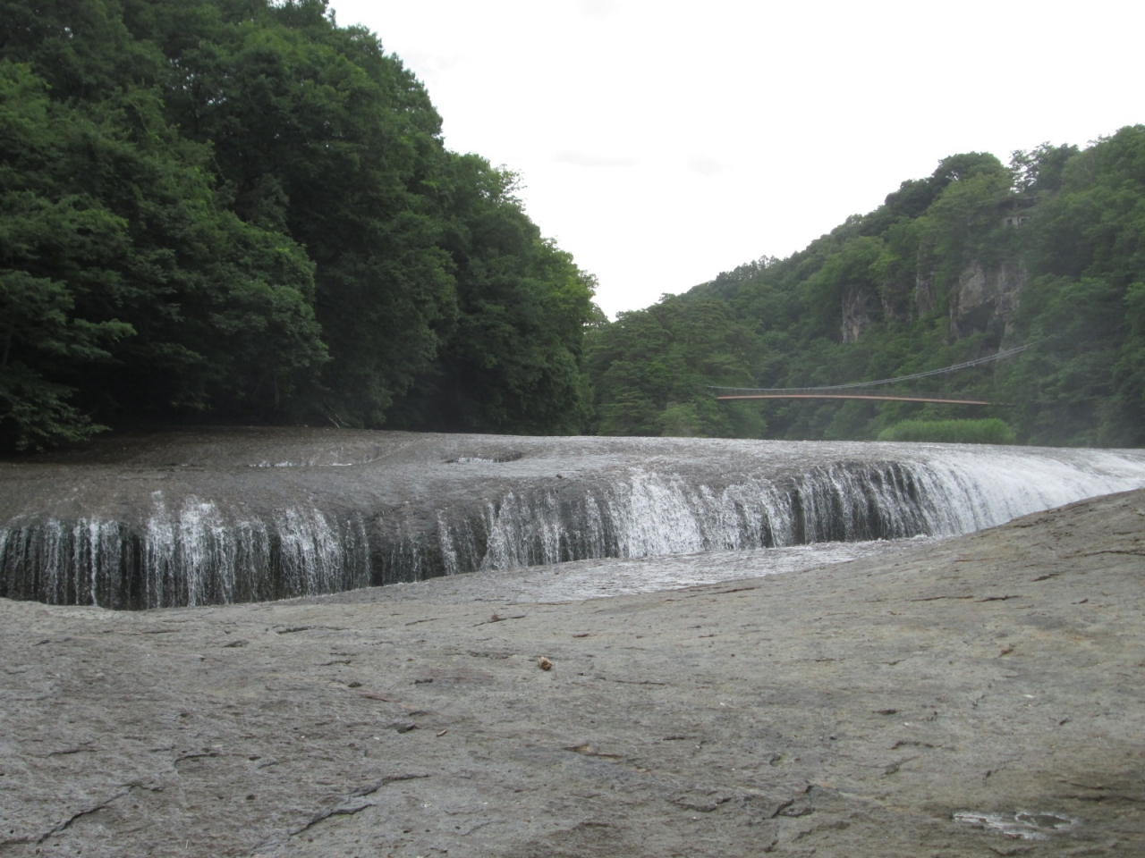 渓谷の遊歩道は湿っていて、足が滑りやすいので注意しながら歩くと、岩盤の割れ目に向かって水が流れ落ちていくのが見えて来ました。