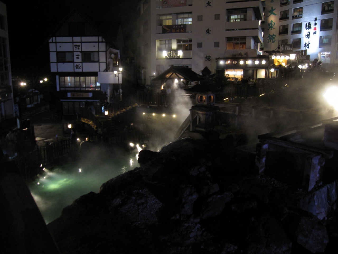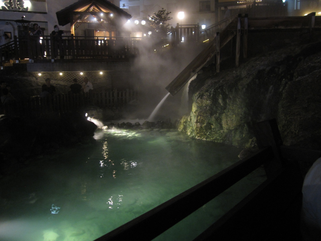硫黄の匂いが漂い、舞い上がる湯けむりがライトアップされ、すごく幻想的な光景でした。
