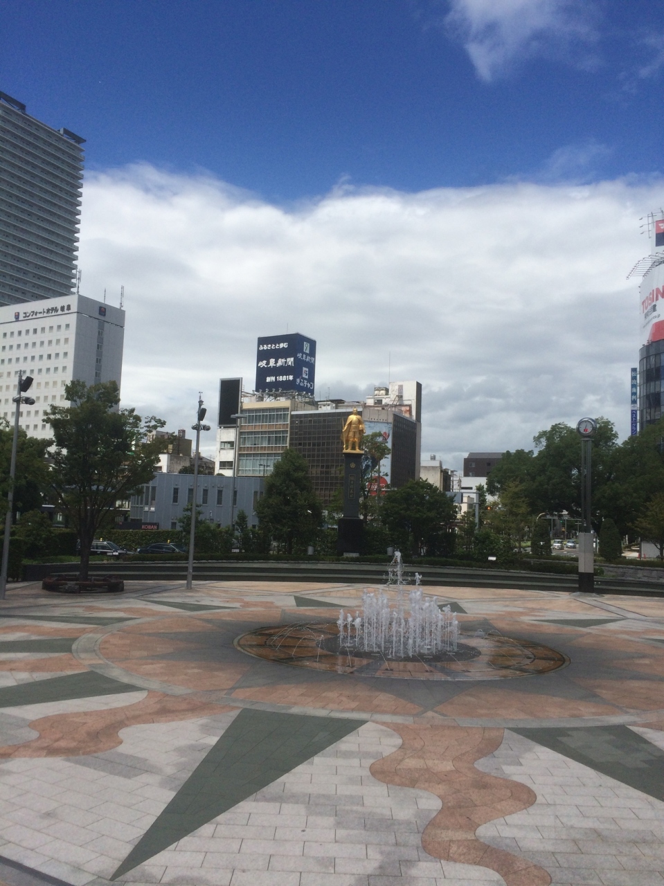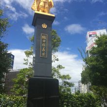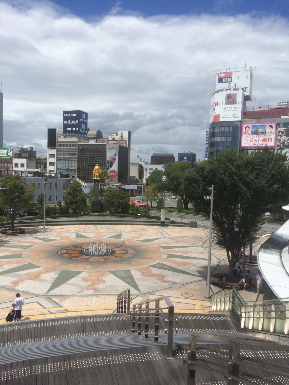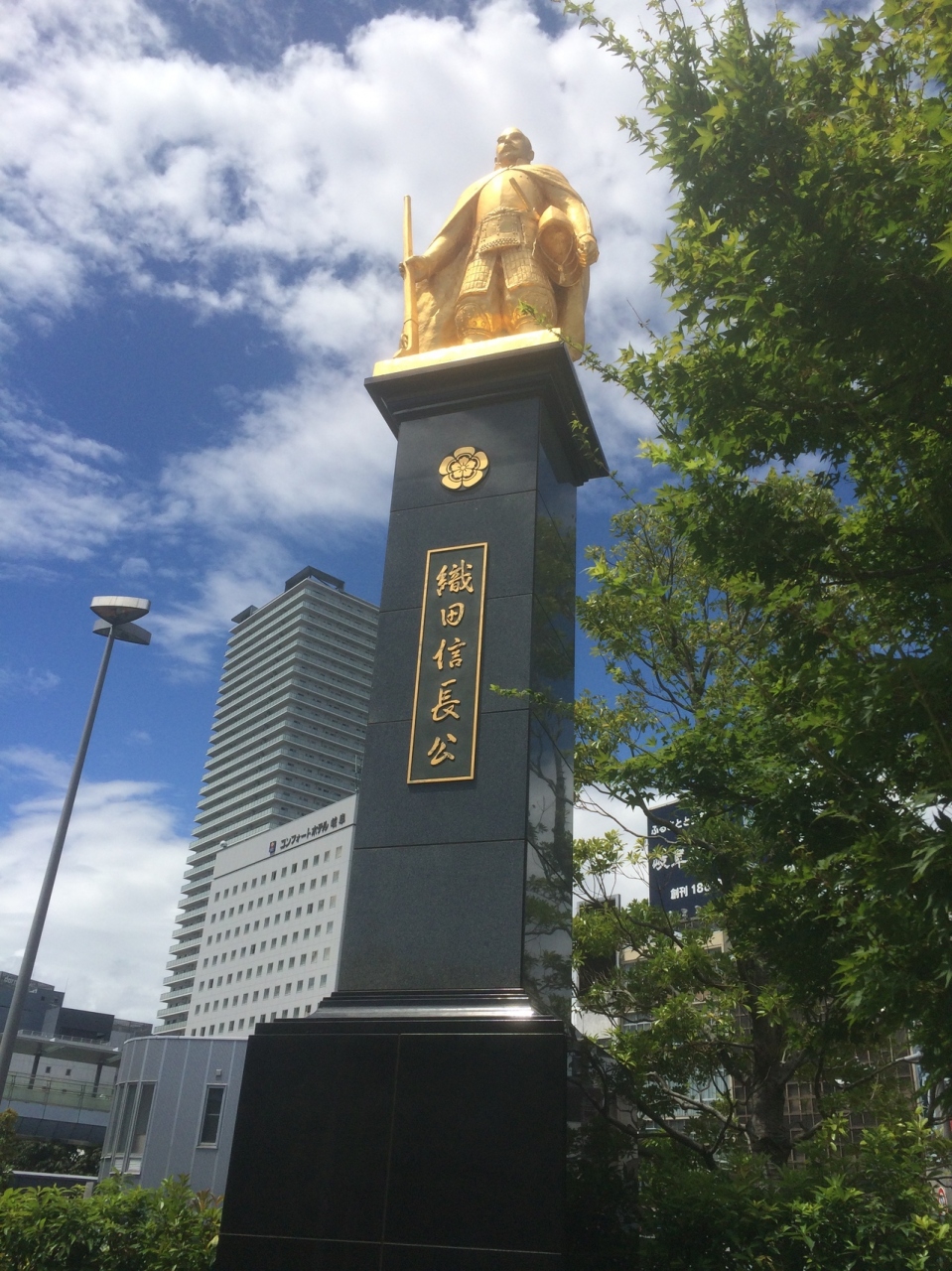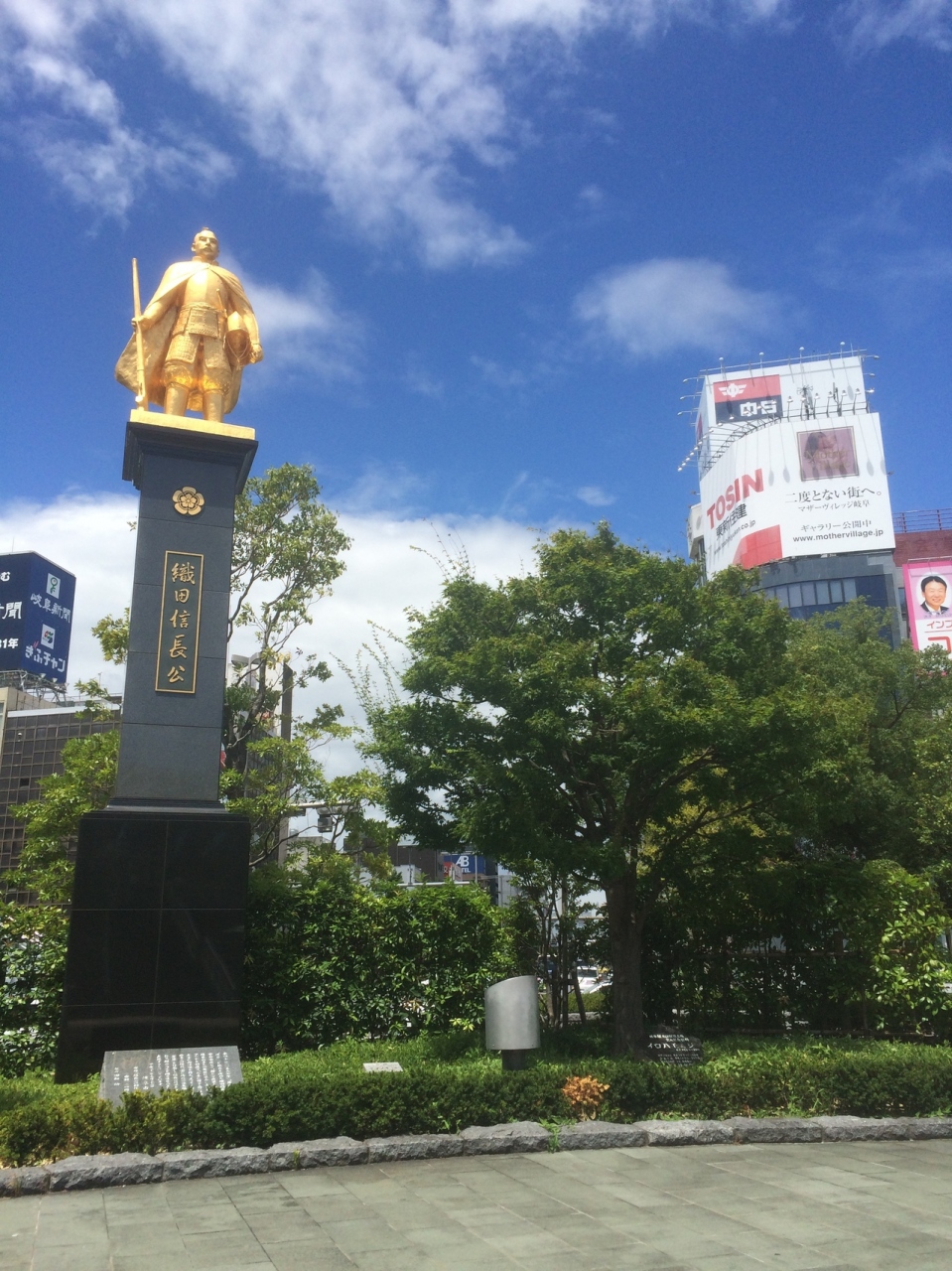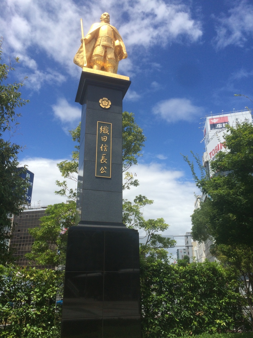 JR岐阜駅前の広場にあり、像の少し手前には噴水があり、隣はバスターミナルです。いかにも織田信長らしく金色の派手の像で高さも高い位置にありました。武士の姿をしマントを羽織っていて堂々と構え威厳がある像でした。