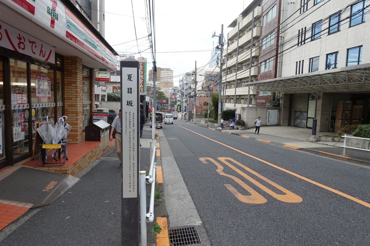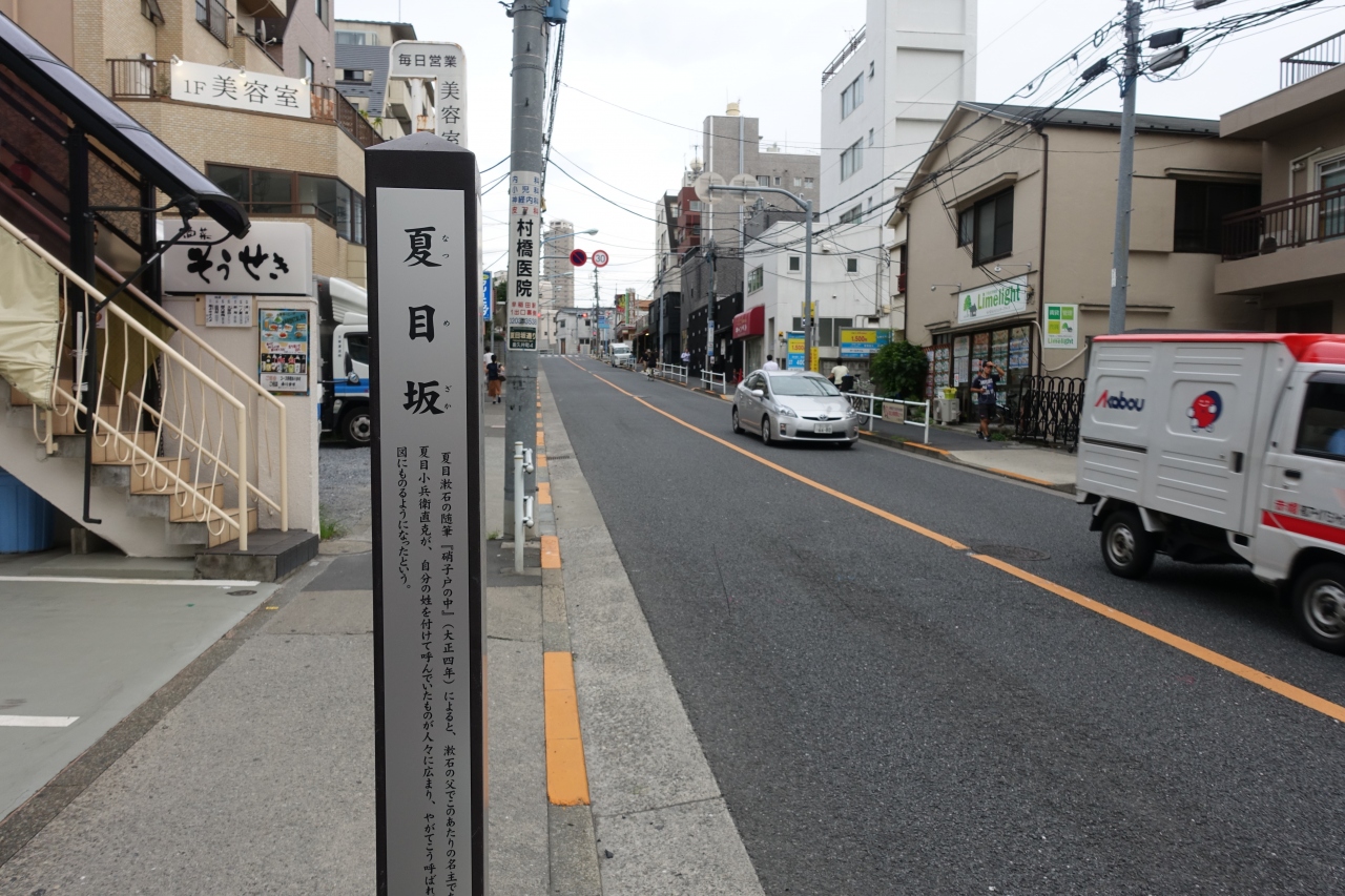 地下鉄早稲田駅前交差点から南へ上り坂です。坂下、中間、坂上付近にそれぞれ標識が設置され、簡単に説明が書かれていました。坂の名前は夏目漱石に因んだものではなく、このあたりの名主であった漱石の父親が自分の姓をつけたものでした。漱石が名を残す前から夏目坂だったのは意外でした。