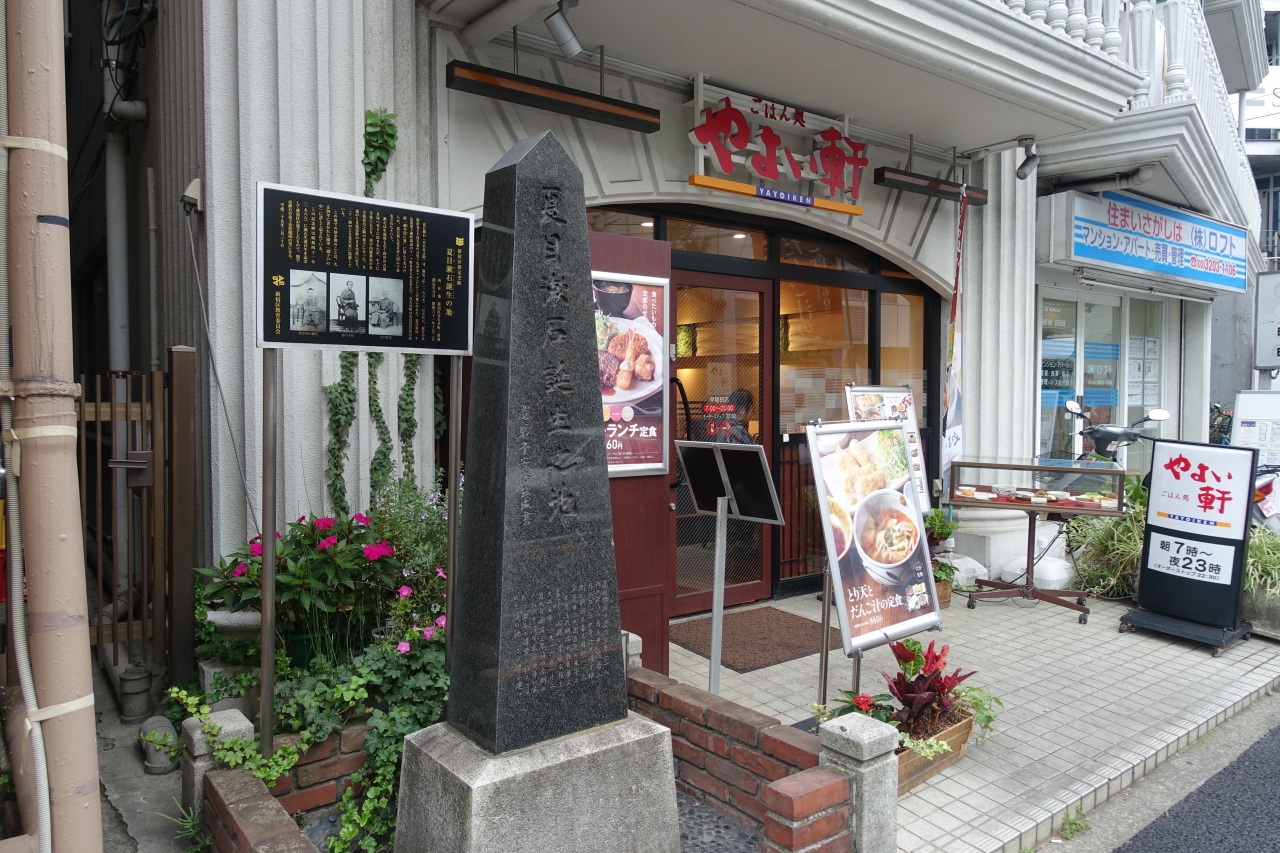 坂下にあるやよい軒の前には、夏目漱石誕生の地の石碑が建っているので合わせて見るのがおすすめです。