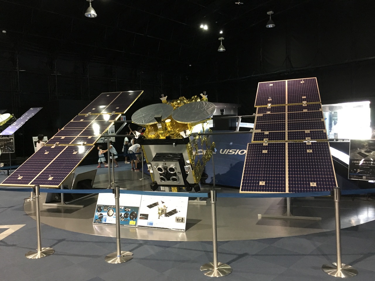 車を停めて展示館の「スペースドーム」に向かうと、まず正面に100万分の1スケールの地球がどーんとあります。中には本物のロケットエンジンが展示されていたり、船内実験室の模型やはやぶさ2の模型もありました。宇宙に少しでも興味ある子供ならきっとわくわくするような場所。それに対して大人にとっては、人工衛星が金色にキラキラして輝き、そして迫力のある写真がたくさん撮れる嬉しい場所という感じですかね。