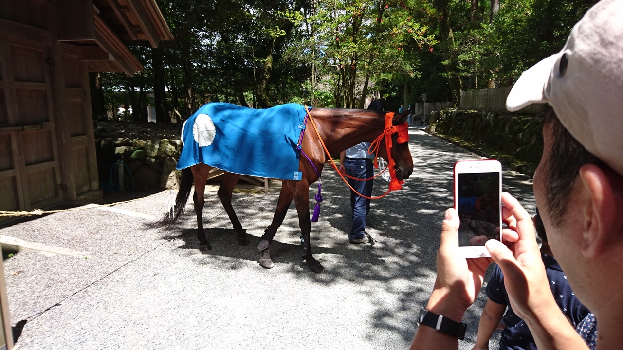 外宮を参拝後、内宮への直通バスに乗り、参拝しました。バスを降りると参拝客で賑わっていました。五十鈴川で手を清め、風宮や本殿、荒御魂をお参りしました。内宮には、神馬がいて、ちょうど馬舎から出て行くところが見れました。