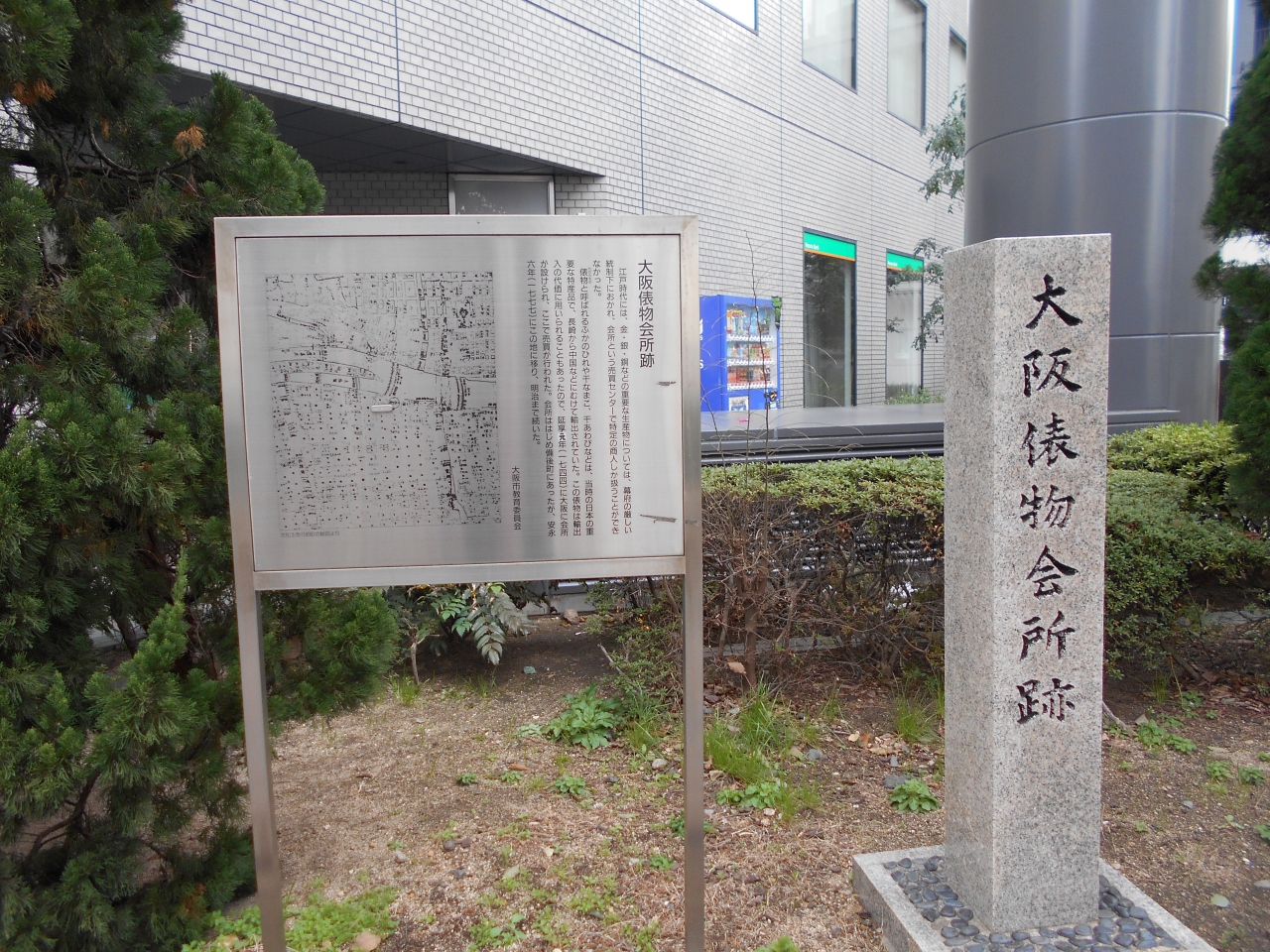 江戸時代商業のメッカでああった北浜の堺筋と土佐堀通り交差点南西角囲いに建つ石碑と由緒版。この辺りは江戸時代諸藩の蔵屋敷が立ち並び商業が活発に行われた場所で海外貿易の決済に俵物(輸出品を袋詰めしていた事から名付けられた)で置き換えられたそうです。その場所が会所であったようです。商業の街大阪ならではの碑ですね。