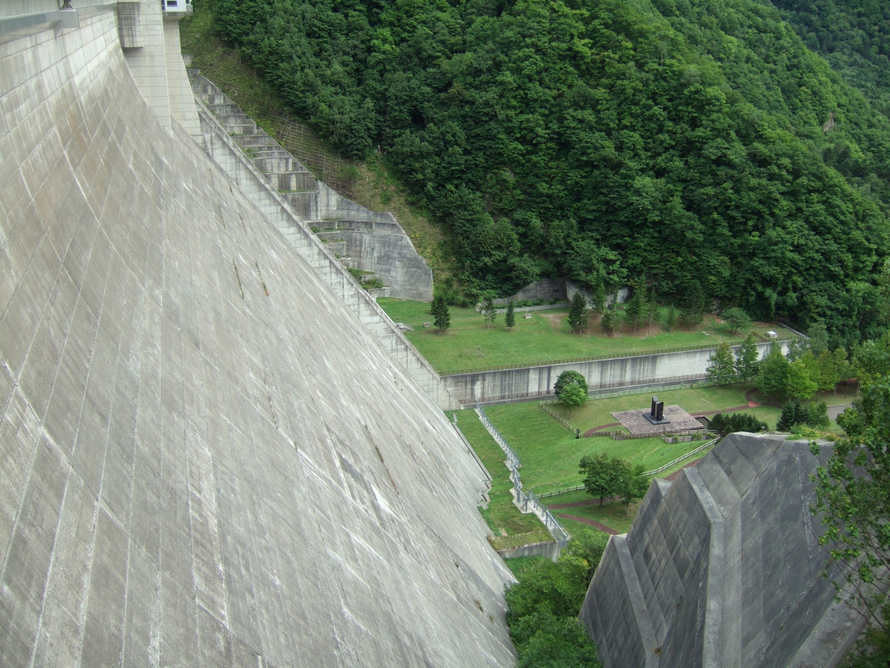 ダムとの高低差を実感しますが、見上げるダムは大迫力です。放水してたら最高だと思います。