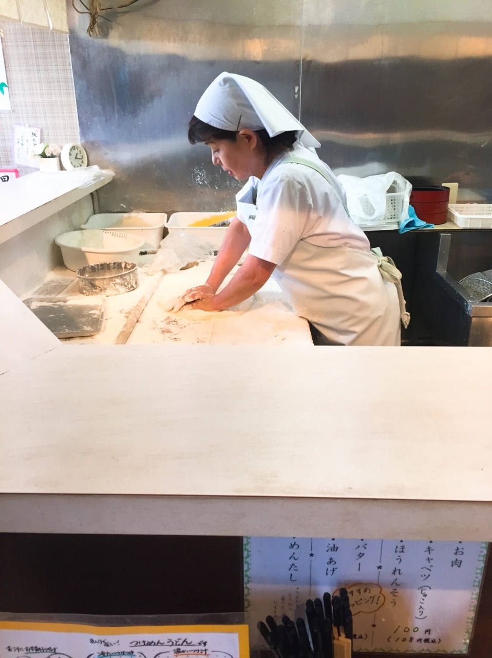 うどんを手打ちしている職人さんをみながら、注文したうどんを待ちます。 とにかくコシが強いので、歯や顎が弱い人には不向きなのか、もう両親はここのうどんは食べられない...とか。 私はまだまだ大好き! 少しでも柔らかいのが好みの方用に、やわ(やわらかめ)や、あつやわ(麺が温かく、柔らかめ)というのも選べ、周りのお客さんは、やわを注文してました。