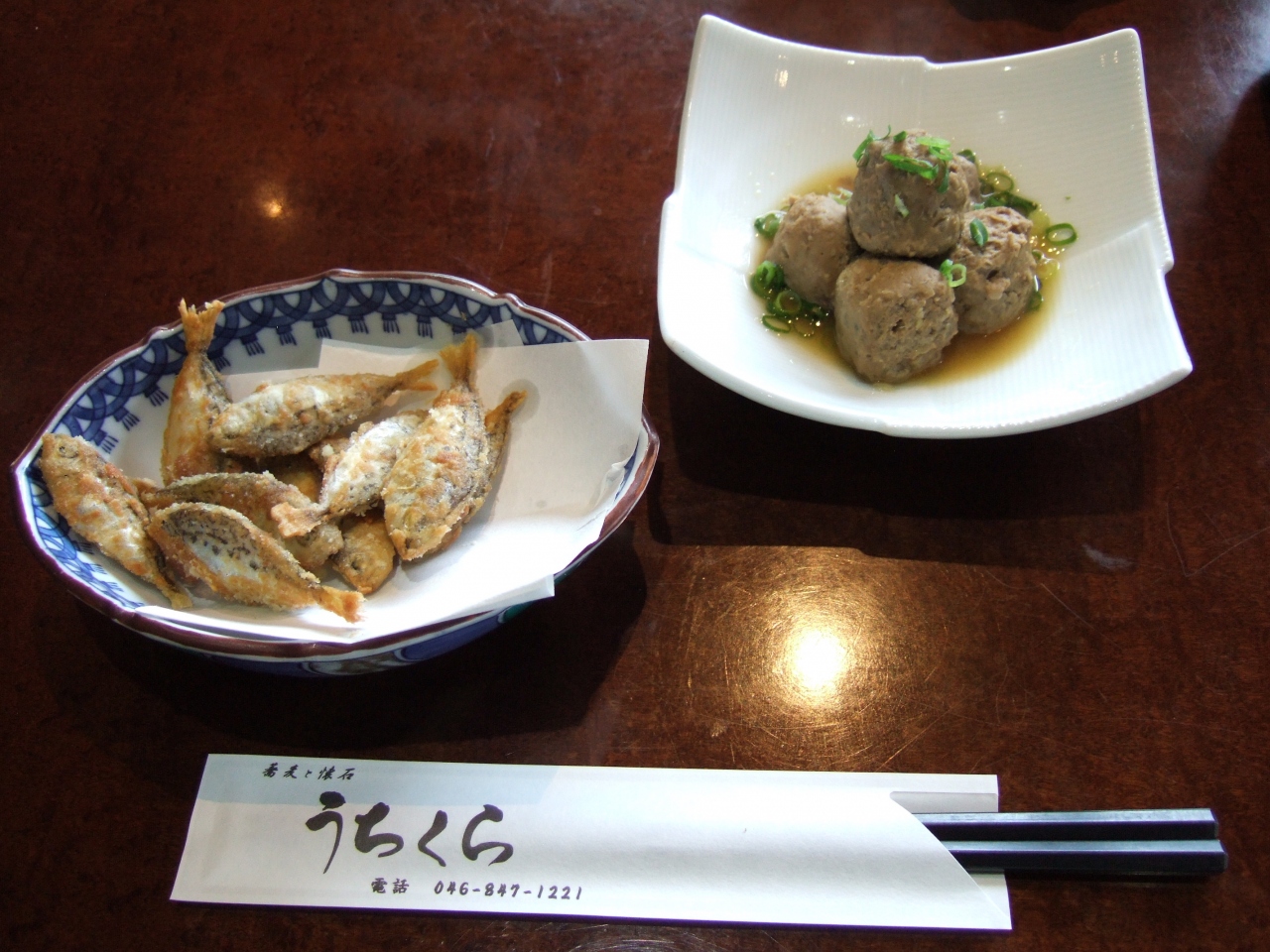 まずはひいらぎの唐揚げといわしつみれ煮で冷酒を一杯。これで一皿200円未満とは素晴らしいです。