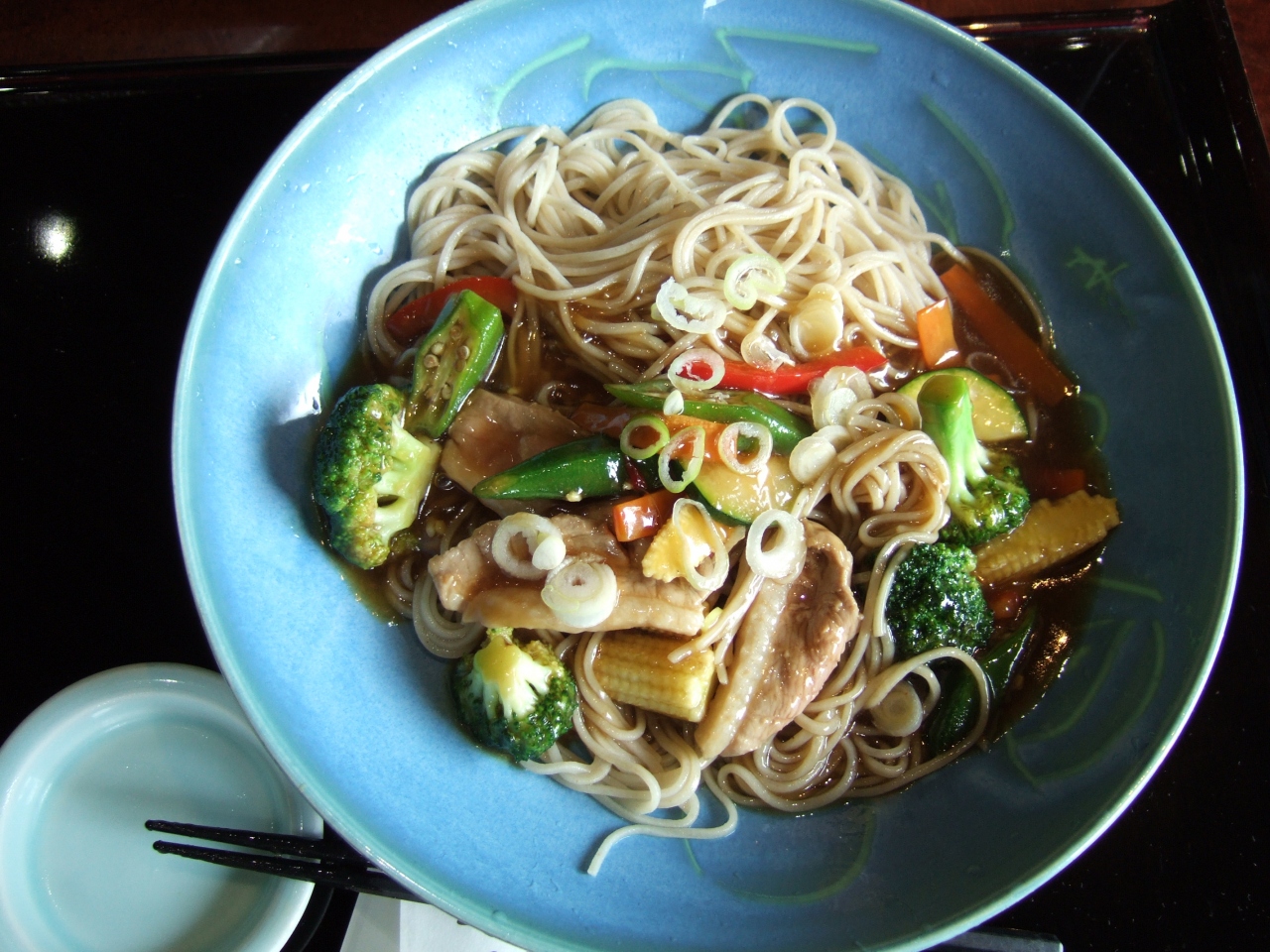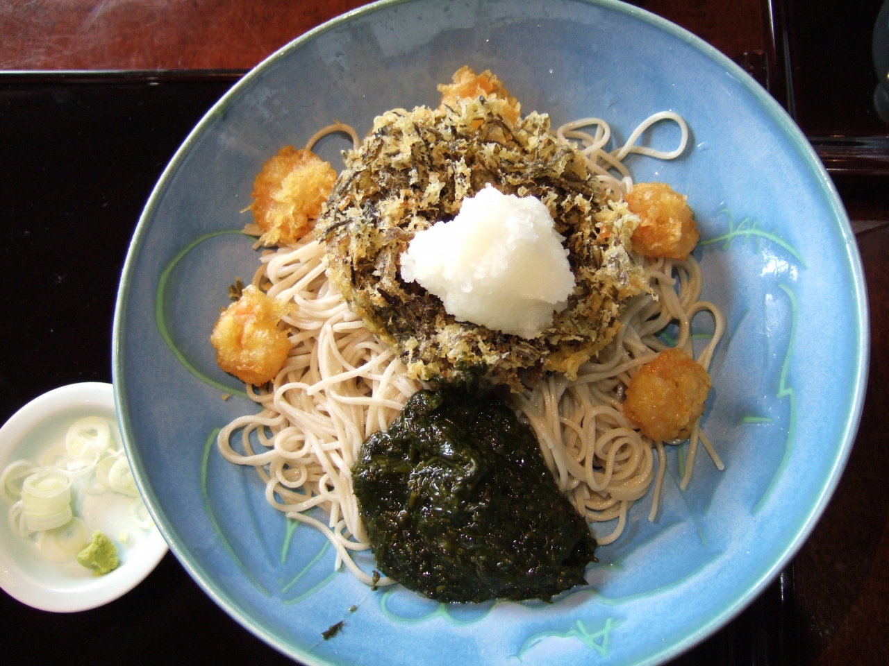 蕎麦のメニューは夏らしいものがあり、あかもく蕎麦、揚げ茄子蕎麦、夏野菜のあんかけ蕎麦をオーダー。意外とボリュームがありますが、さっぱりといただけました。