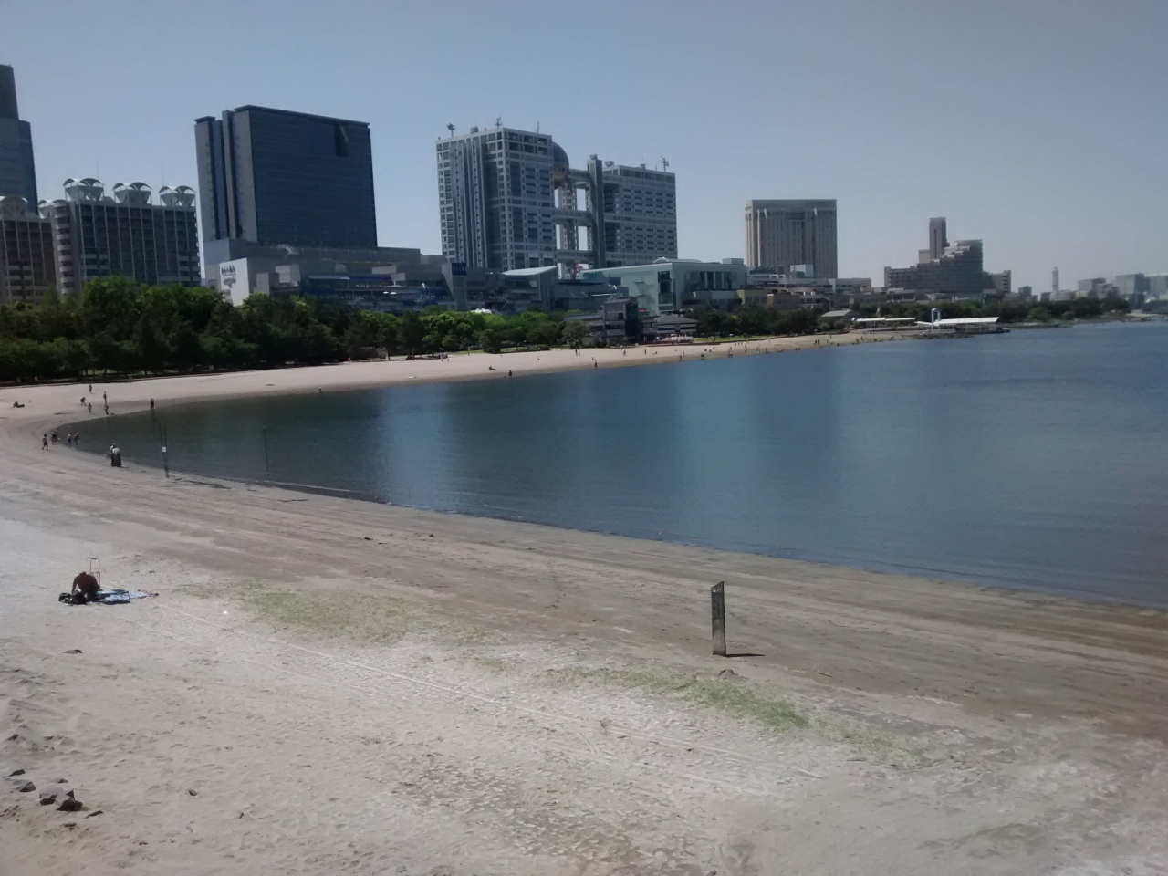 お台場海浜公園は、オリンピックの競泳競技に適さない水質ということで、最近のニュースで取り上げられましたが、訪問時には、とてもきれいな水質に感じました。ここの海岸は波がなくて穏やかで、周囲の景色も最高で、文句なしです。