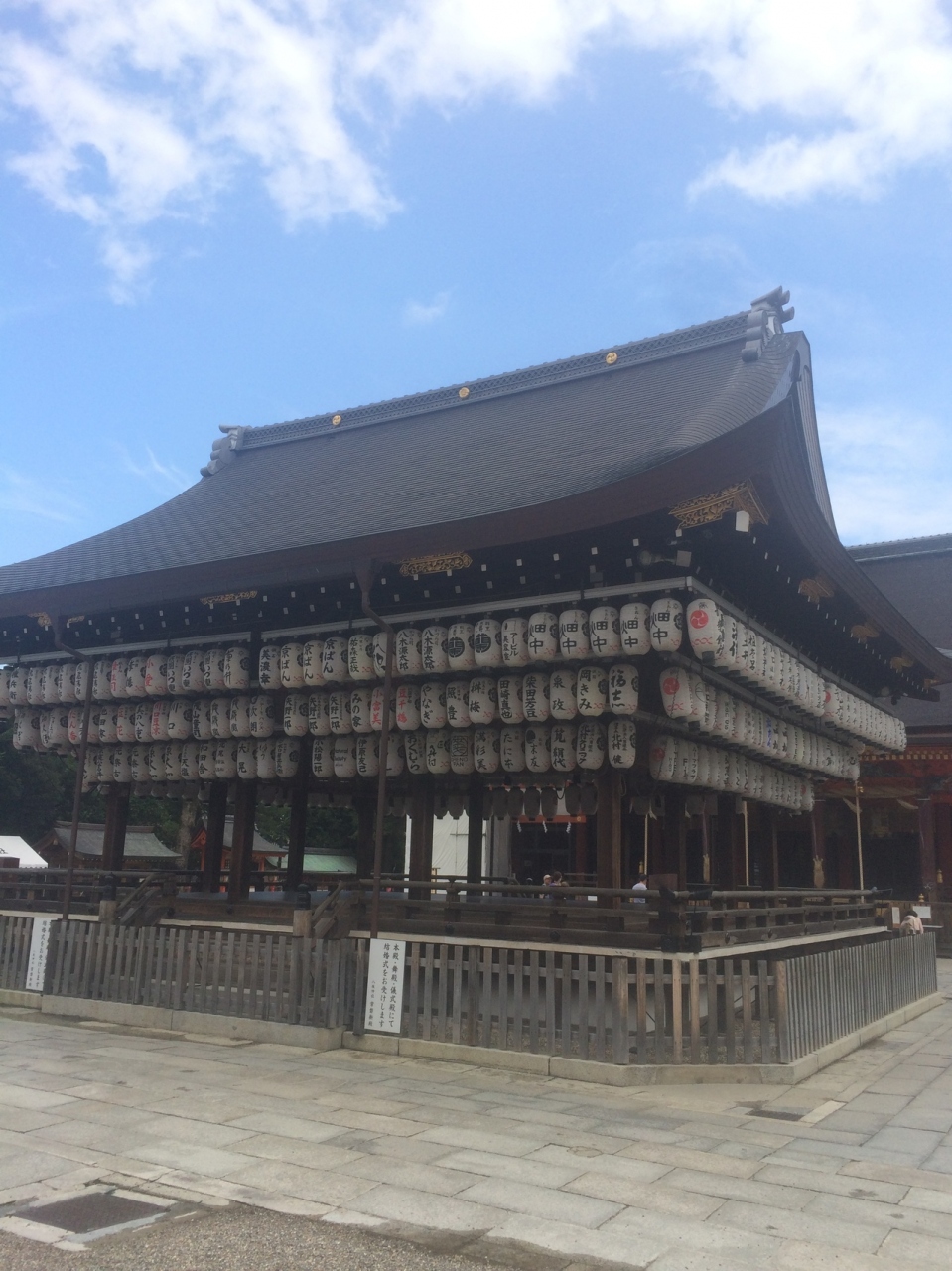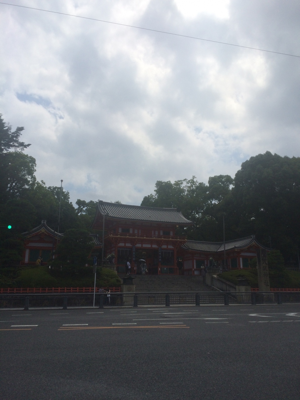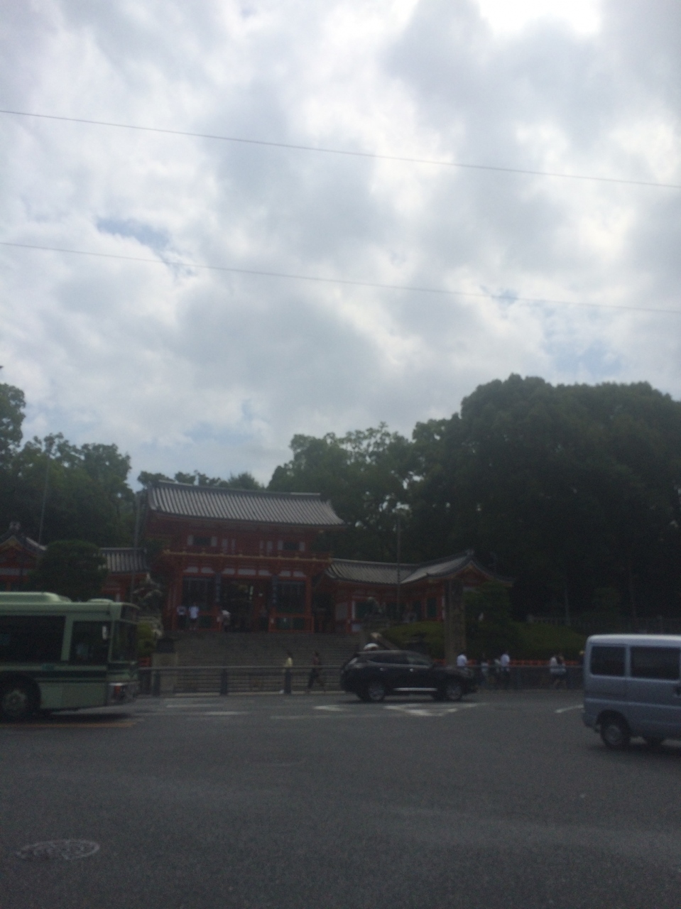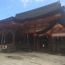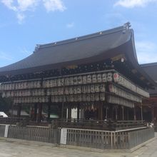 大通り沿いの石鳥居が良い雰囲気で、階段を上ると赤い門があり左右には武士の姿をした人物像がありました。赤い建物が多かったですが、少し古びた黒系の建物もあります。境内の中には小さな神社がいくつかあり、神社は円山公園とつながっています。