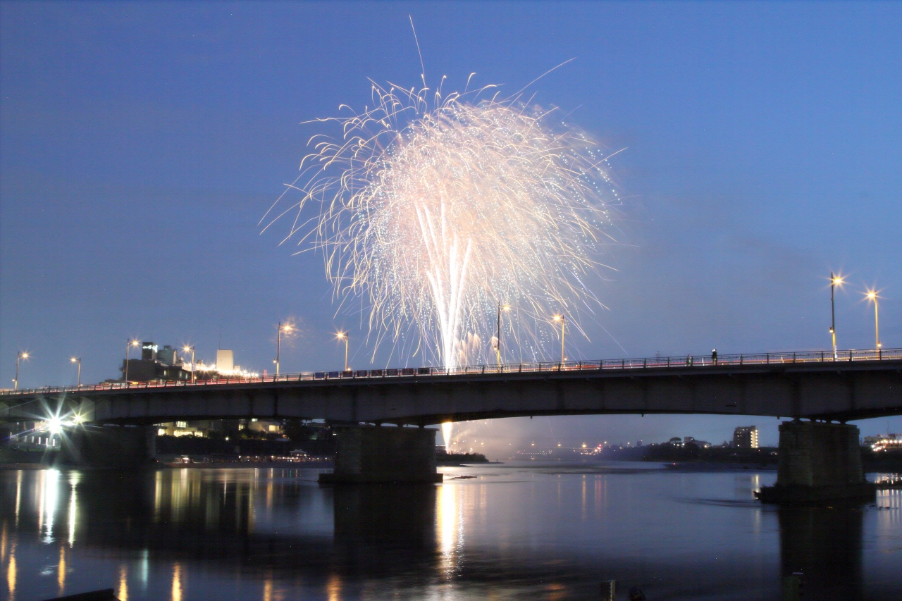 長良川河川敷で繰り広げられる大きな花火大会でした。2時間ほど前に着いたのですが、正面の河川敷は満員&混雑状態。仕方ないので、橋の反対側から、橋越しで花火を鑑賞。橋越しでも花火は見れました。帰りはバスが混雑していたので、歩いて岐阜駅まで帰りました。(歩いて岐阜駅まで45分くらいです)