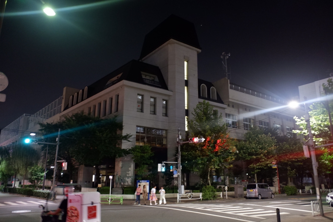 松屋通りを東に進み、平成通りとの交差点に差し掛かったところ、角にクラシカルで見事な建物がありました。京橋小学校と築地小学校が統合してできた「京橋築地小学校」という事です。夜遅い時間で暗がりという事もあり、小学校とは気づきませんでした。平成通りは、築地界隈では飲食店やショップは少なく、新旧の建物が同居しているのが面白いです。