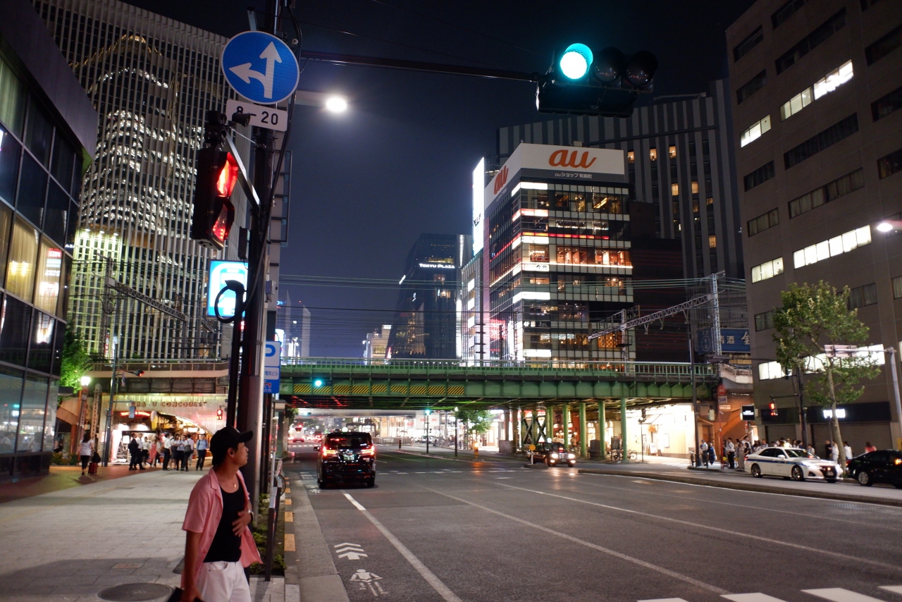 丸の内仲通沿いのレストランで食事をした後、宿泊ホテルまで戻る際に、晴海通りを渡りました。銀座エリアと日比谷エリアの違いか、もしくは夏休み期間のためなのか、晴海通りには車も人も少なく、平日の夜9時の光景とは思えないほどでした。光を放つ東京ミッドタウン日比谷の高層ビルのみが印象に残りました。
