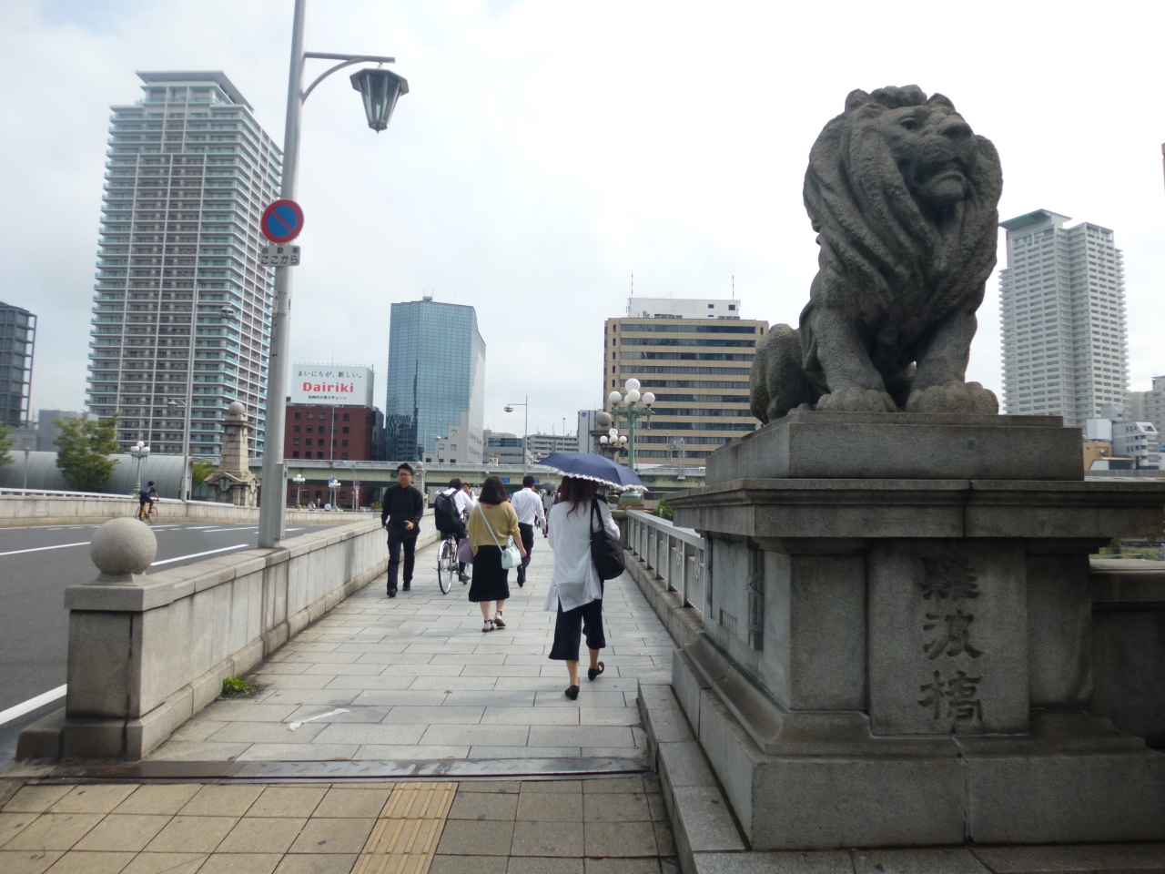 堺筋が土佐堀川と交わる部分に架かる橋が難波橋です。ライオン橋の異名通り、親柱の部分に見事なライオン像があります。浪速の名橋50選にも選ばれている大阪を代表する橋のひとつです。橋の向うに見える中之島の光景も美しく、絵になる光景がたくさんありました。